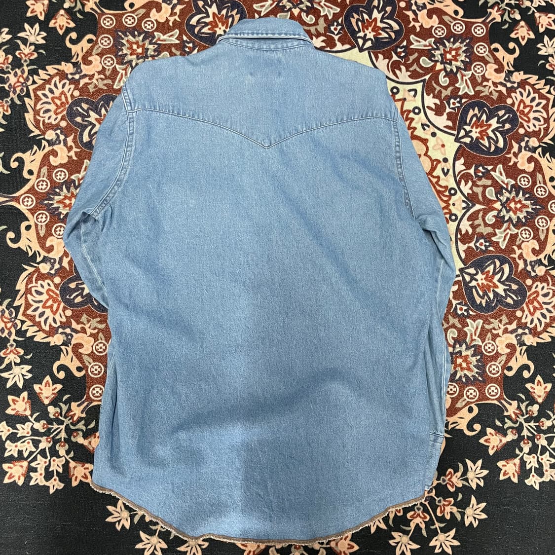Wrangler Wrangler 랭글러 데님 웨스턴 셔츠입니다 코튼 100% 소재 국내 100~105 추천 드립니다. 실측 사이즈:어깨48 가슴57 소매61 총장80 (단위cm) 의류마다 표기 사이즈와 실측 사이즈가 다르니, 구매 전 실측 사이즈를 비교 후 구매하시면 정확한 사이즈를 구매 할 수 있습니다. 사이즈는 재는 방법에 따라 1~3cm 정도 오차가 있을 수 있습니다.