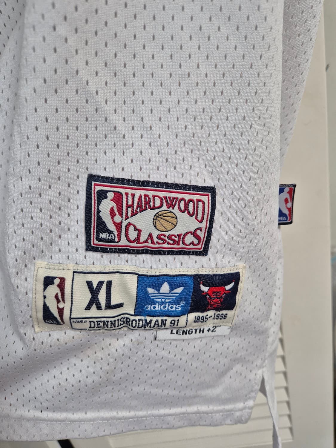 조던보다 더 희귀한 로드맨 제품입니다 전면부에 손가락 마디보댜 작은 얼룩 2개 위아래로 있으며 프린트 퀄리티에는 자연스러운 크랙있습니다 참고해주세요! XL 105~110사이즈 기장감
