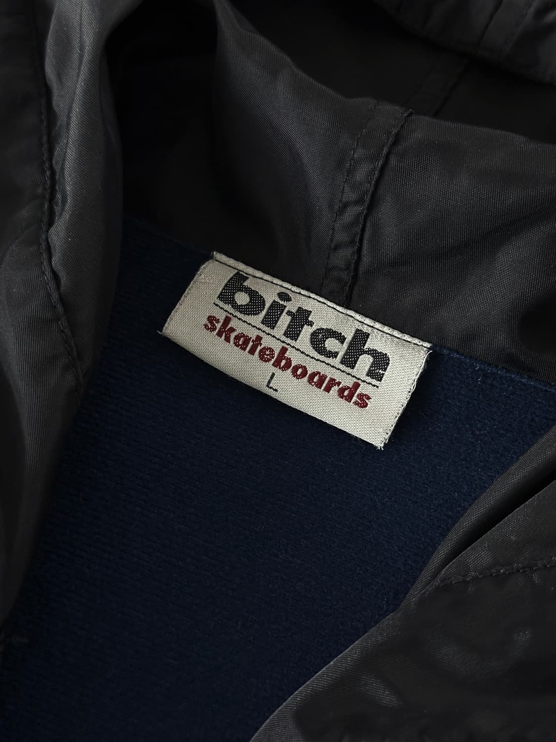 (Rare)90s Bitch Skateboards nylon hooded windbreaker🖤 미국의 스케이트 보드 브랜드인 girl skateboard를 저격하기 위하여 탄생한 브랜드 bitch skateboards의 나일론 후드 윈드 브레이커 입니다🚻 외부는 매트한 광택감이 감도는 나일론 소재로 사용되었으며 내부에는 부드러운 안감이 추가되어 일반 윈드브레이커보다 조금 더 도톰한 두께감을 제공하여, 간절기뿐만 아니라 초겨울까지 활용 가능한 실용적인 아이템입니다💣 앞면에 브랜드 로고패치와 지퍼 및 스토퍼에도 브랜드 각인이 되어있으며, 뒷면 허리라인에도 은은하게 자수 로고가 들어가 있어 브랜드 아이덴티티가 돋보이는 제품 입니다🪄 루즈한 오버핏 실루엣으로 제작되어 다양한 이너와 레이어드가 가능하며, 스케이트 보드 문화 특유의 반항적인 무드가 잘 느껴지는 제품입니다✨ 우수한 컨디션으로 입고 되었으며, 전문 클리닝을 완료 하였습니다🫧 size - 실측 XL~2XL사이 (표기 L) (어깨-53cm, 가슴-63.5cm, 총장-75cm, 팔-63cm)