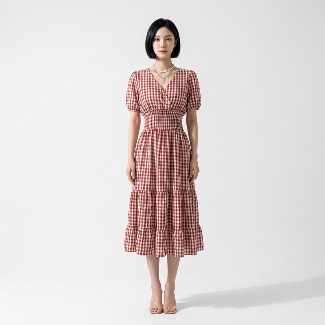 에잇세컨트 레드 체크 원피스 넓은 스모킹 밴딩으로 가슴과 허리라인이 돋보이고 자연스러운 주름이 매력적인 원피스 레이온 혼방이라 여름에 시원하게 입기 좋아요 레이온 50% 폴리 50% 빨강 / 크림 표기 F지만 44~55반까지만 권장 가슴 45cm 허리 30-45cm 총장 108cm 소매 24cm