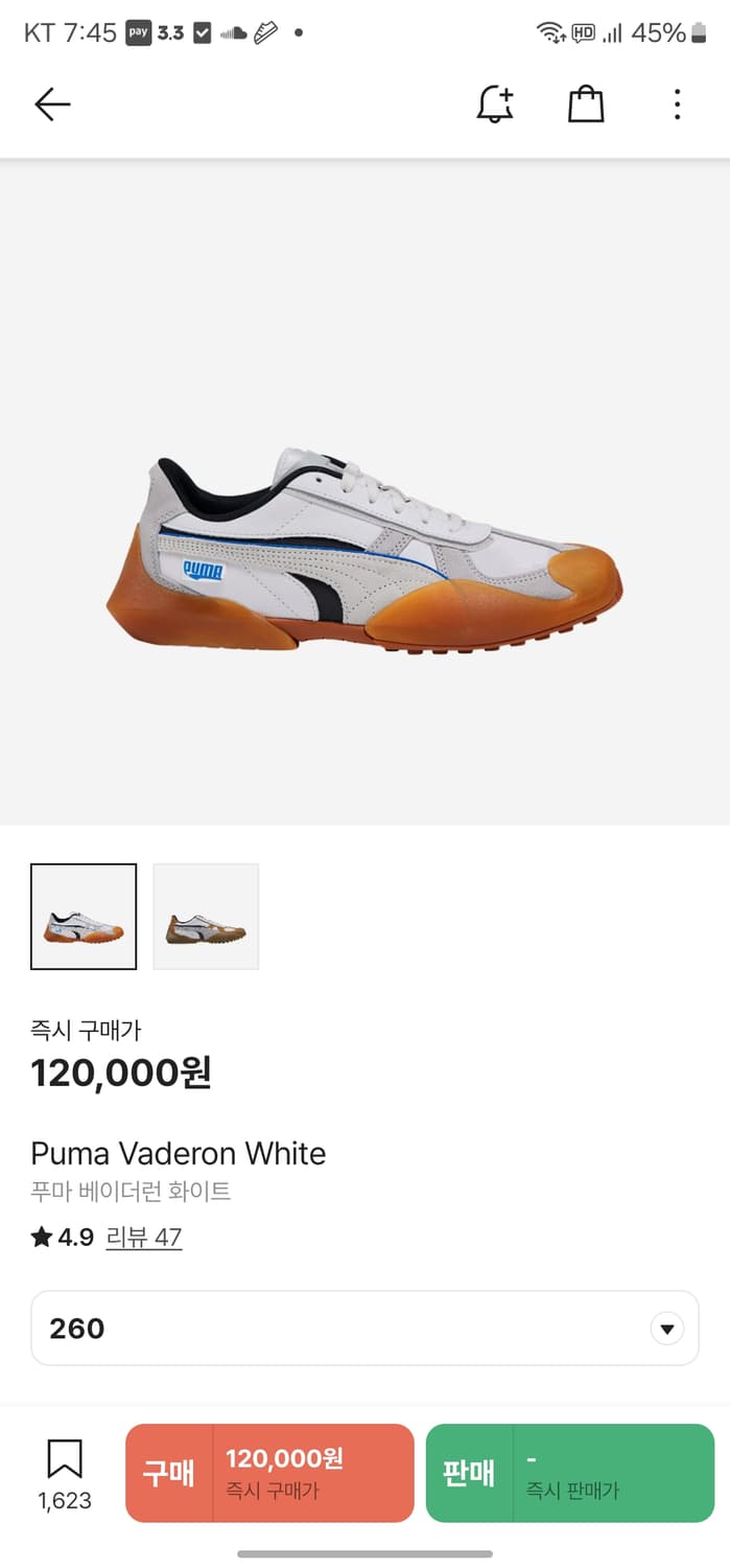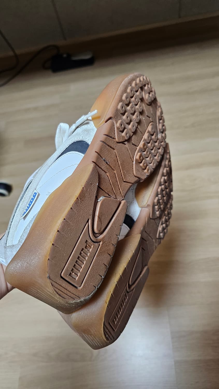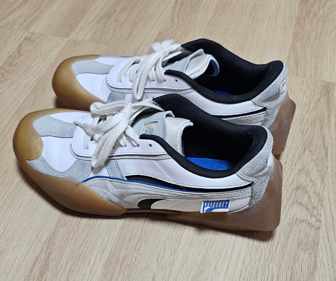 푸마 베이더론 260 입니다 보시다시피 상태가 굉장히 좋고 실착은 5회 미만입니다. 와이드팬츠 어떤컬러와도 잘 붙습니다 현재 크림에서는 리셀이 조금 붙어 동일한 사이즈 12만원에 판매되고 있습니다. 좋은 가격에 가져가셨으면 좋겠습니다🙂