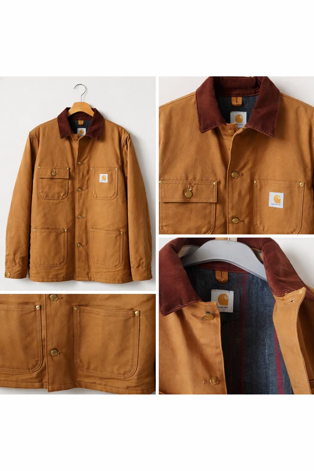 실착 1~2회로 거의 새상품급 컨디션입니다.오염 및 하자 없이 깔끔하게 보관 중입니다. 브라운 덕 캔버스 소재에 코듀로이 카라 디테일이 들어간Carhartt 대표 워크웨어 라인 초어코트입니다.클래식한 4포켓 디자인으로 활용도 높습니다. 사이즈 S (정사이즈)