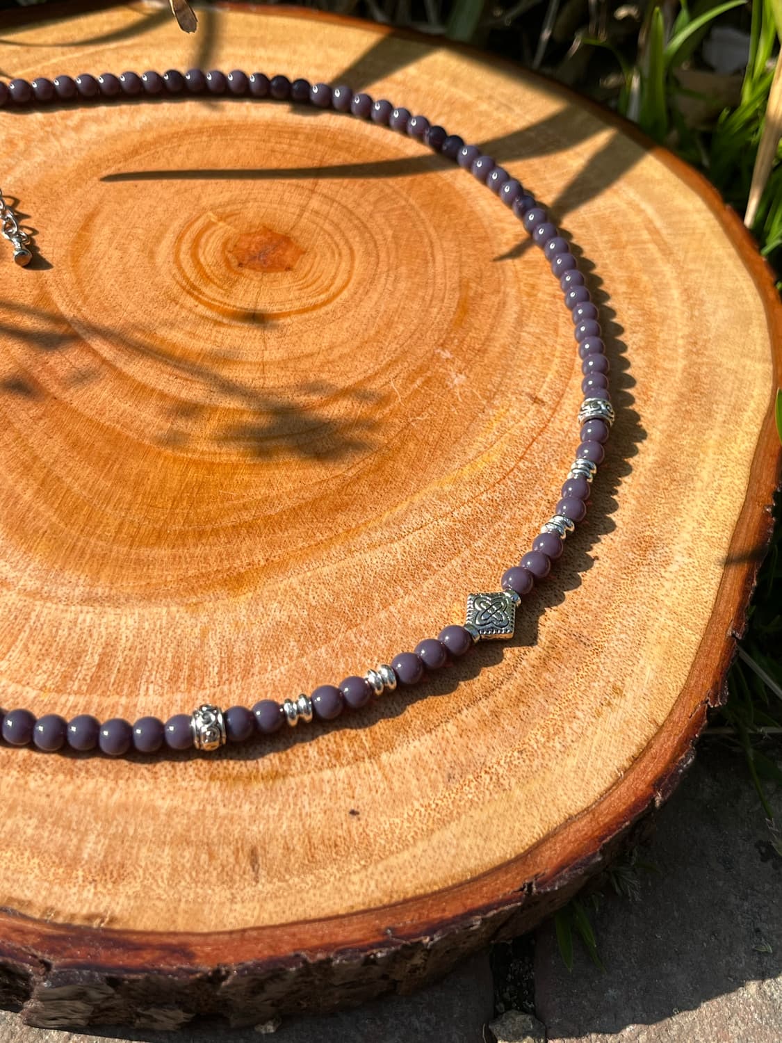 <Material> Brass, Surgical steel, 아크릴 <About this piece> 퍼플색과 바이올렛 색상의 중간인 매력적인 톤다운 컬러의 비즈를 베이스로 두었으며, 촌스럽지 않은 고급스러운 퍼플 컬러이기에 여름에 시원하면서도 차분한 무드로 착용하실 수 있습니다. 센터와 사이드에는 오너먼트 참을 배치하여 실리만의 무드를 한 스푼 추가하였습니다. <Size> Original size - 43cm (+4cm) (길이 연장을 원하시면 문의 부탁드립니다.)