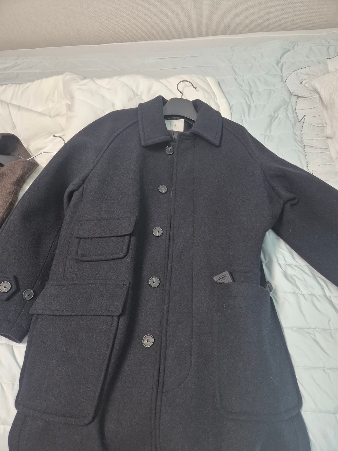 깔끔한 디자인의 210 EDIT 블랙 울 코트예요 사진에서 보이는 것처럼 100 사이즈로 나왔어요 1회 입고, 안어울려서 판매합니다. 거의 새상품입니다