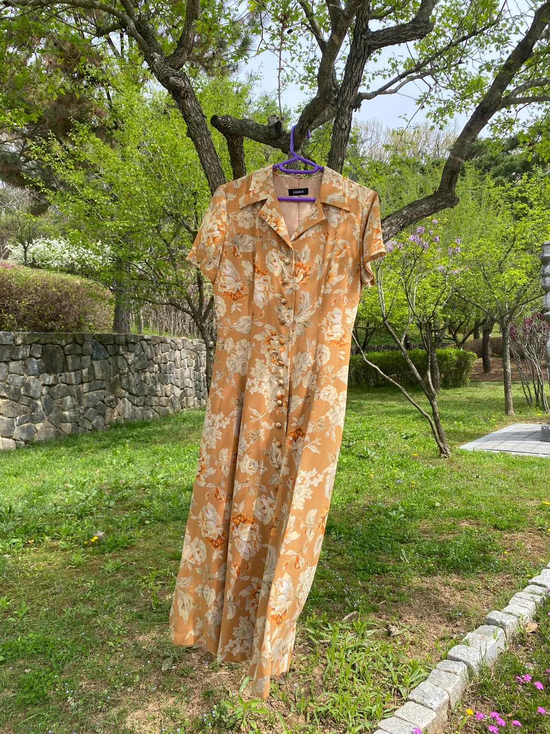 어깨40 가단48 총장123 “햇살이 깊게 내려앉은 오후, 누군가를 만나러 가는 길에 입는 드레스” 따뜻한 오렌지 브라운 컬러 위에 부드럽게 번지는 플로럴 패턴은 단순히 화사한 게 아니라, 시간이 지나며 더 깊어진 색감처럼 느껴진다. 허리를 자연스럽게 잡아주는 실루엣과 단정한 카라, 그리고 버튼 디테일은 어딘가 단정하면서도 여성스러운 분위기를 만든다. 이 옷은 편안함보다는 “조금 더 나를 신경 쓰고 싶은 날 꺼내 입는 옷“ 교환,환불x
