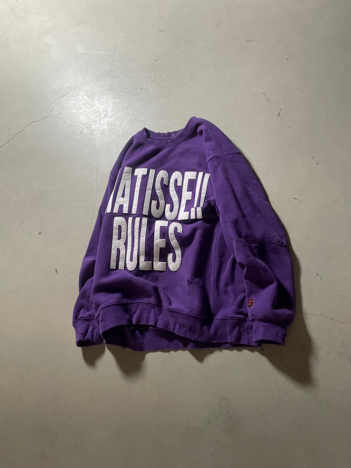 Product Info • Brand : Jackson Matisse • Item : Distressed Logo Sweatshirt • Color : Purple • Material : Cotton • Size : OS • Measurements : 품60cm / 총장74cm ⸻ Description 일본 Jackson Matisse의 로고 스웻셔츠입니다. 전면 “MATISSE!! RULES” 대형 프린트와 함께, 데미지 디테일과 자연스러운 워싱이 더해져 브랜드 특유의 빈티지 감성을 보여줍니다. ⸻ Styling Tips 와이드 데님이나 밀리터리 팬츠와 매치해 스트릿 무드를 강조하기 좋으며, 루즈한 실루엣으로 단독 착용만으로도 충분한 포인트가 되는 아이템입니다. ⸻ About Brand Jackson Matisse는 일본 기반의 브랜드로, 빈티지와 아메리칸 캐주얼을 재해석한 그래픽과 디테일로 주목받고 있습니다.