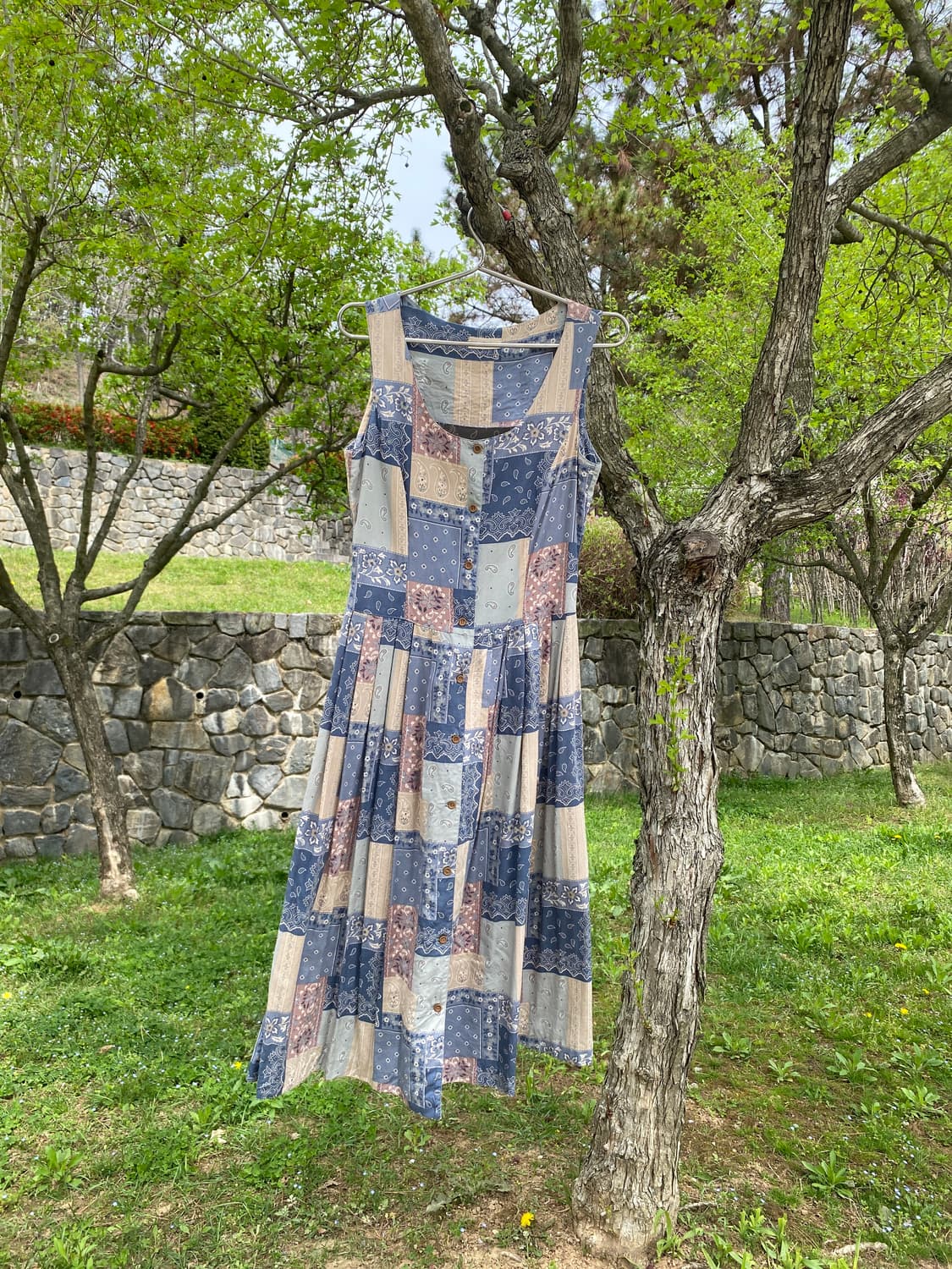 “평범한 하루를 조용히 빛나게 만드는 원피스” 여러 조각의 패턴이 이어 붙여진 듯한 디자인은 마치 서로 다른 시간들이 하나로 이어진 느낌을 준다. 차분한 블루와 베이지 톤이 섞이면서 튀지 않지만 오래 바라보게 되는 힘이 있고, 자연스럽게 퍼지는 실루엣은 조용한 움직임마저도 부드럽게 만들어준다. 이 옷은 특별한 날보다 “아무 일 없는 하루를 더 특별하게 만들어주는 옷” 교환,환불x
