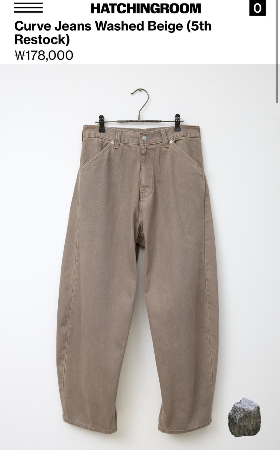 Curve Jeans Washed Beige 2사이즈입니다. 실착 3회 미만 상태는 좋고 하자는 없으나 보관 과정에서 밑단 구겨짐이 있습니다.
