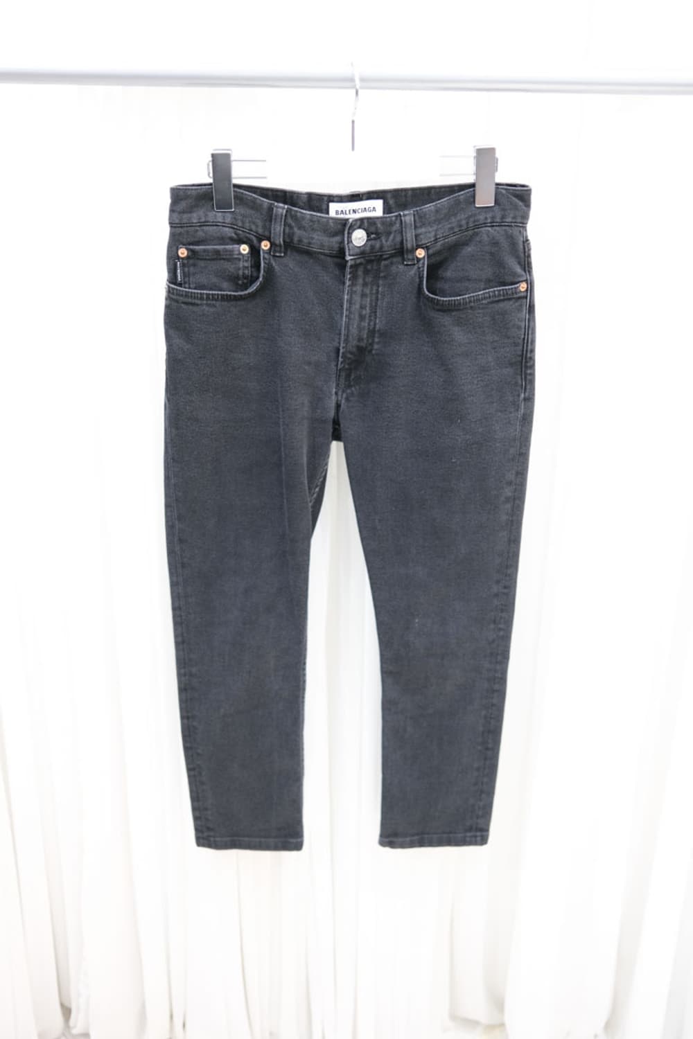 Balenciaga º Size (바닥에 두어서 최대로 측정) 허리 39cm 허벅지 24cm 밑단 15cm 총장 84cm º Material Cotton 98% , Elastane 2% º Balenciaga 팬츠입니다. 워싱된 블랙 데님 컬러에 8부 기장감으로 활용도 높은 아이템입니다.