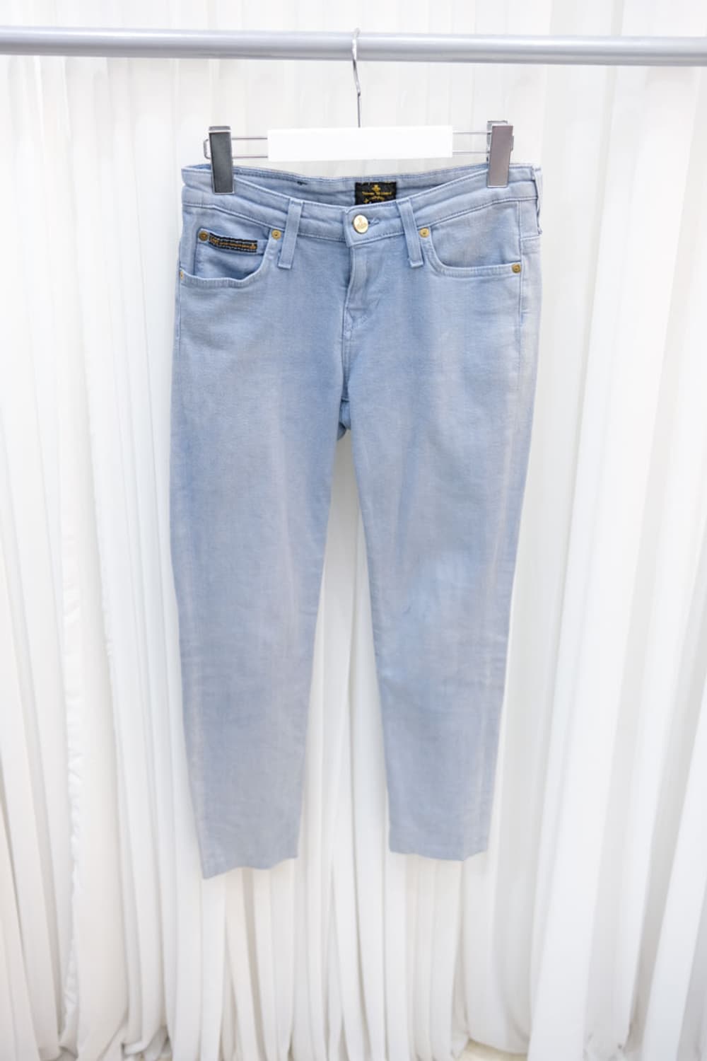 Vivienne Westwood Anglomania X Lee º Size (바닥에 두어서 최대로 측정) 허리36cm 허벅지 24cm 밑단 14cm 총장 87cm º Material Cotton 97.4% , Elastane 2.6% º Vivienne Westwood Anglomania X Lee 팬츠입니다. 라이트 워싱 데님과 슬림한 실루엣, 그리고 후면의 골드 패치 디테일이 인상적인 팬츠입니다.