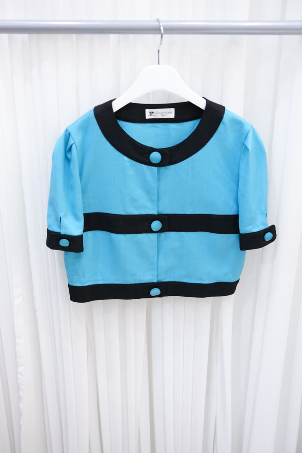 Courrèges º Size (바닥에 두어서 최대로 측정) 어깨 37cm 가슴 45cm 팔 25cm 총장 46cm º Material Nylon 35% , Rayon 35% , Polyester 30% º Courrèges 자켓입니다. 볼드한 배색과 버튼 디테일, 그리고 5부 소매에서 미니멀한 프렌치 무드가 느껴지는 아이템입니다.