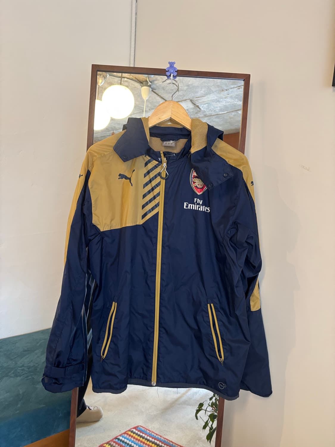 푸마 아스날 바람막이 아스날 엠블럼과 Fly Emirates 마크가 선명하게 프린팅 되어 있습니다. 푸마 로고도 확인해주세요! 후드 똑딱이 위부분이 한쪽 떨어져있는점 사진참조 어깨+팔 77 가슴 56 기장 72 사이즈 오차1~2cm 발생 할 수 있음