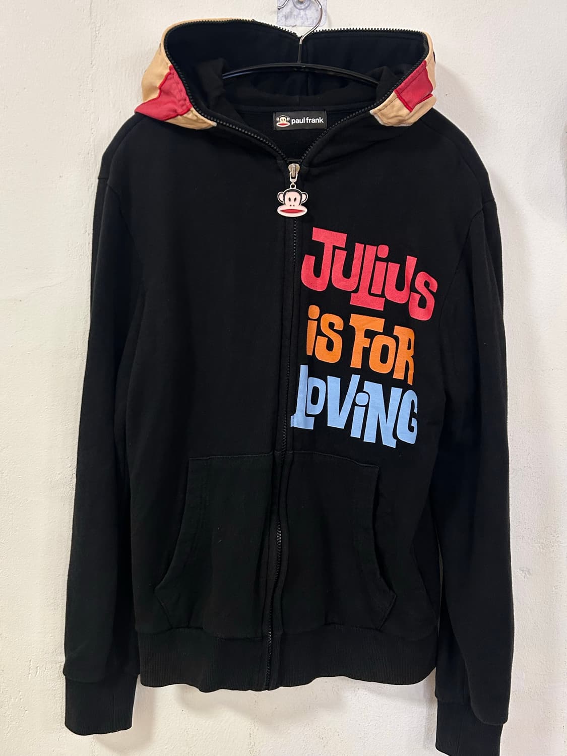 폴프랭크 줄리어스 캐릭터 후드집업입니다. 블랙 색상에 알록달록한 레터링이 포인트로 들어간 캐주얼한 디자인입니다. M(95) 사이즈로 데일리하게 활용하기 좋은 아이템입니다. 다양한 스타일에 매치하기 좋아 편하게 입기 좋습니다. 큰 하자 없이 전체적으로 상태 양호하나 생활 보플이나 약간의 사용감 있어요 가슴너비 50 총장 66 ※ 제품 특성상 교환 및 환불은 불가하오니 구매 전 충분한 확인 부탁드립니다. 배송비 안내 반값택배 2,000원 일반택배 4,000원