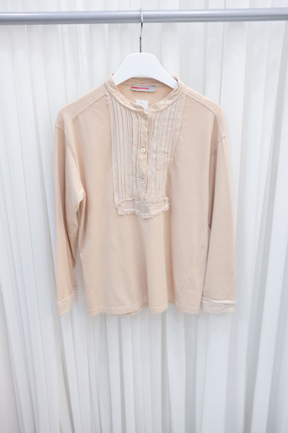 Prada º Size (바닥에 두어서 최대로 측정) 어깨 45cm 가슴 46cm 팔 50cm 총장 60cm º Material Cotton 100% º Prada 롱슬리브입니다. 네크라인의 핀턱 디테일이 눈에 띄는 옅은 복숭아 빛의 롱슬리브입니다.