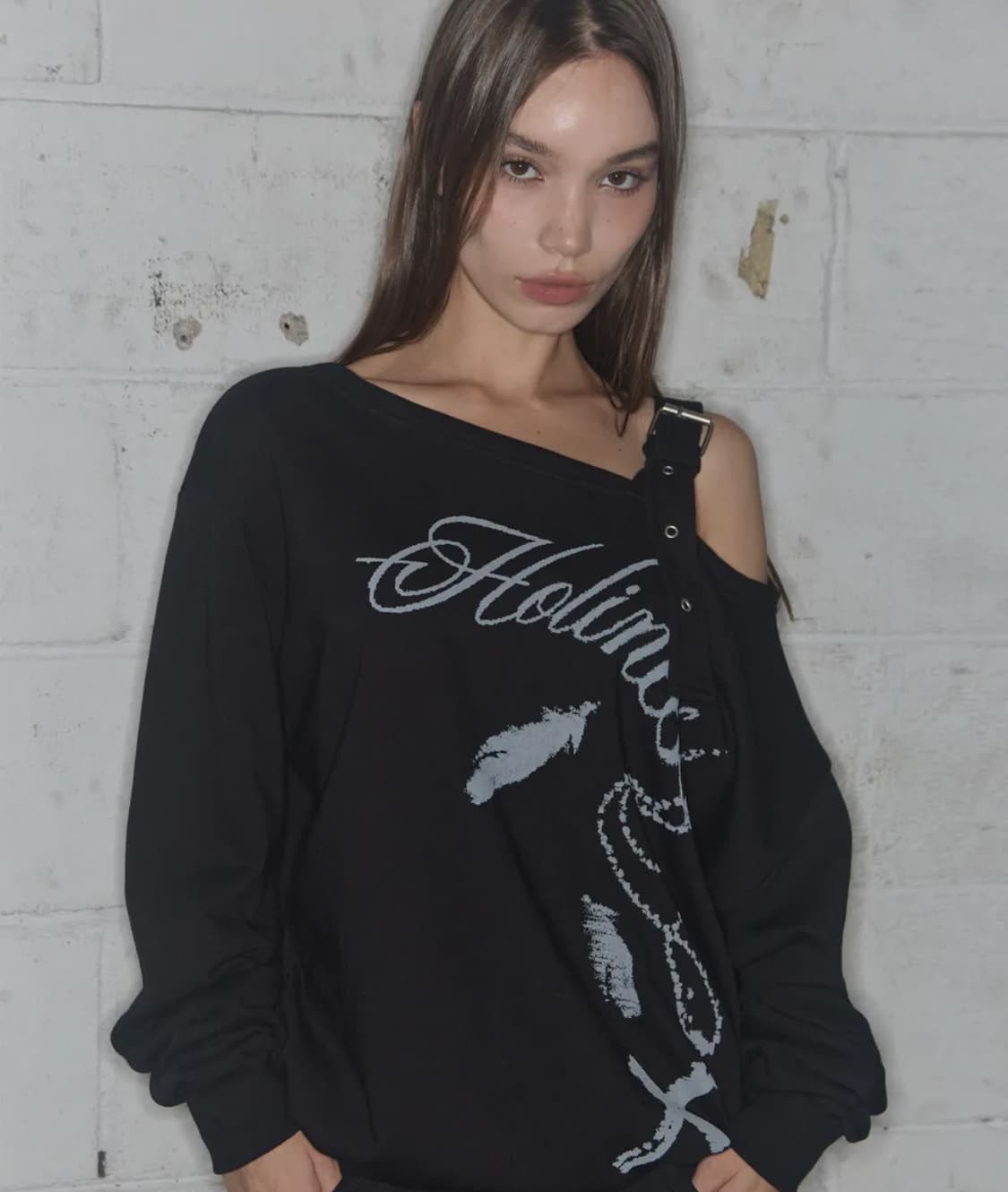 일리고 129 버클 오프숄더 맨투맨 블랙