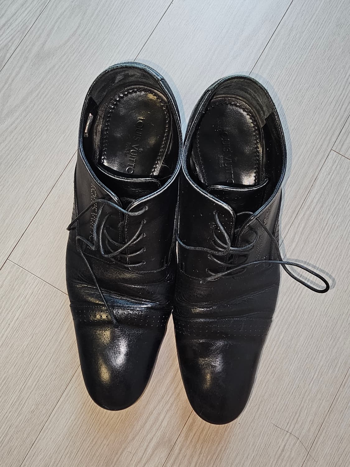 루이비통 블랙 남성 구두입니다. 사진에서 보시는 것과 같이 사용감은 조금 있습니다. 그래도 꼼꼼히 관리하면서 신어서 상태 좋습니다. 별도 문의 없으시면 바로 안전결제 부탁드려요! 중고정품입니다 상태는 사진그대로입니다 뒷굽은 덧댐 보강되어있습니다 사이즈 7.5 배송착불