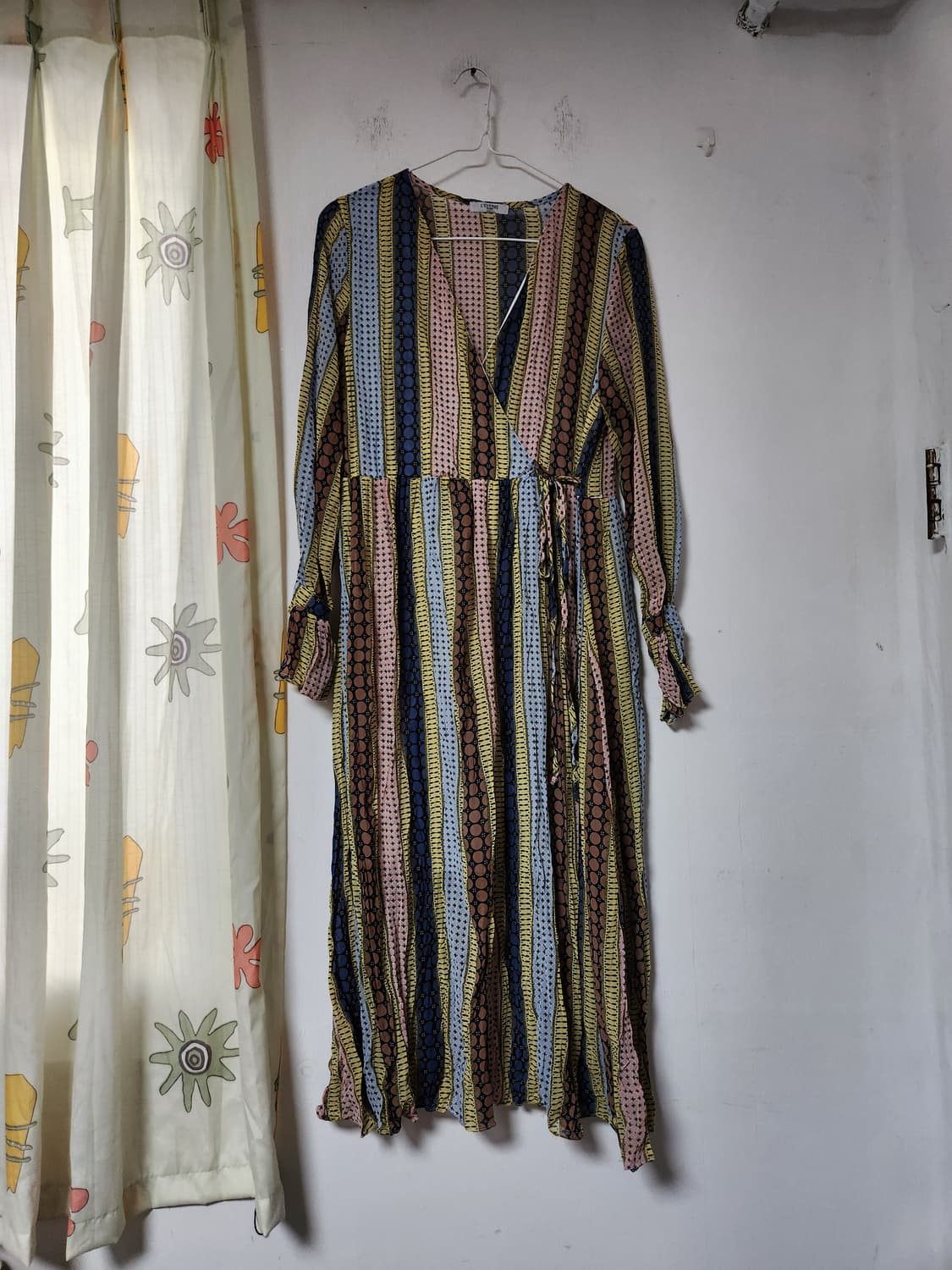 L'ECCOVE 브랜드 스트라이프 롱 원피스예요 상체 랩 스타일이고 치마부분은 안감있어요 허리끈으로 사이즈맞게 입으시면 될거같고 앞가슴쪽도 안감있고 독특한 패턴이 매력적인 제품입니다. 상태 다 좋은데 가슴벌어진곳 핀으로 여민자국 약간의 헤짐있네요 감안하여 저렴히 올려요 예민하신분 피해주시고 뒷기장은 110센치예요 문의 없으시면 바로 안전결제해주시면 됩니다!