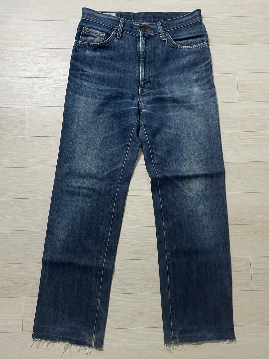 전포 빈티지샵에서 구매한 에드윈 402모델입니다. 표기사이즈 허리 32인치이고 실측은 30정도입니다! 전반적으로 사용감이 있고 밑단이 트여있습니다. 내구성에 직접적인 문제가 될 정도의 하자는 전혀 없습니다. 실측사이즈(cm) 총장 102 허리 40 밑위 30 허벅지 27 밑단 21