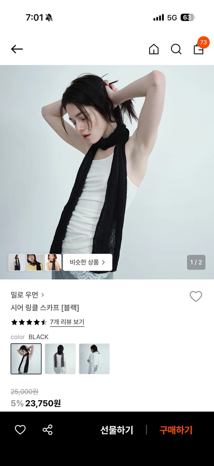 밀로우먼 스카프입니다 한번 착용햌ㅅ구요! 엄청 부드럽고 가벼워요 다른컬러 구매해서 요건 판매합니다