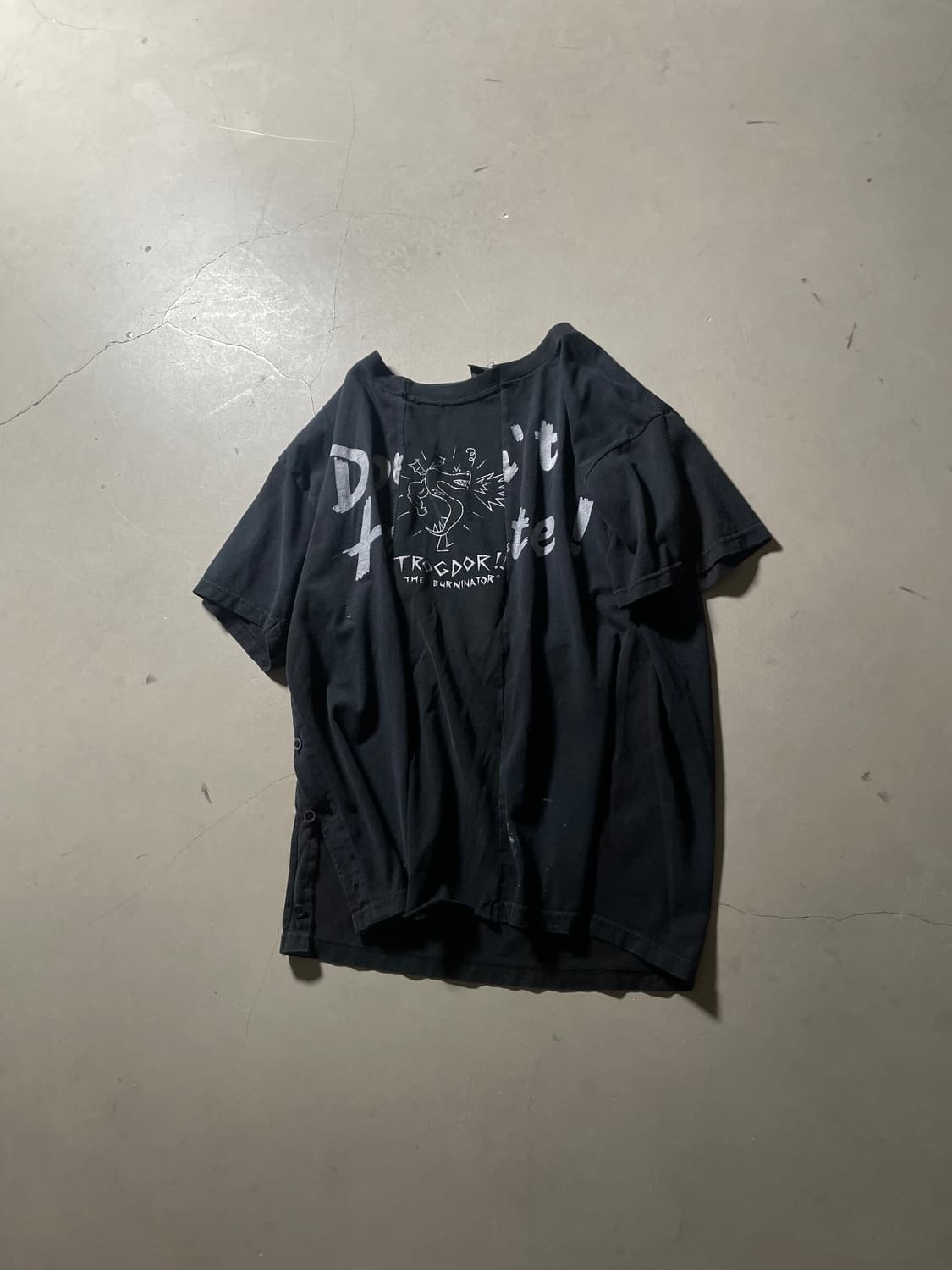 Product Info • Brand : H•C Custom • Item : Vintage Custom Graphic T-shirt • Color : Black • Material : Cotton • Size : OS • Measurements : 가슴 59cm / 총장 73cm ⸻ Description H•C에서 커스텀된 빈티지 그래픽 티셔츠입니다. 전면 그래픽과 백 프린팅, 그리고 사이드 버튼 디테일이 더해져 단순한 티셔츠를 넘어선 리워크 무드를 보여줍니다. 여유 있는 실루엣과 자연스러운 사용감이 어우러져 빈티지 특유의 감도를 잘 살린 제품입니다.