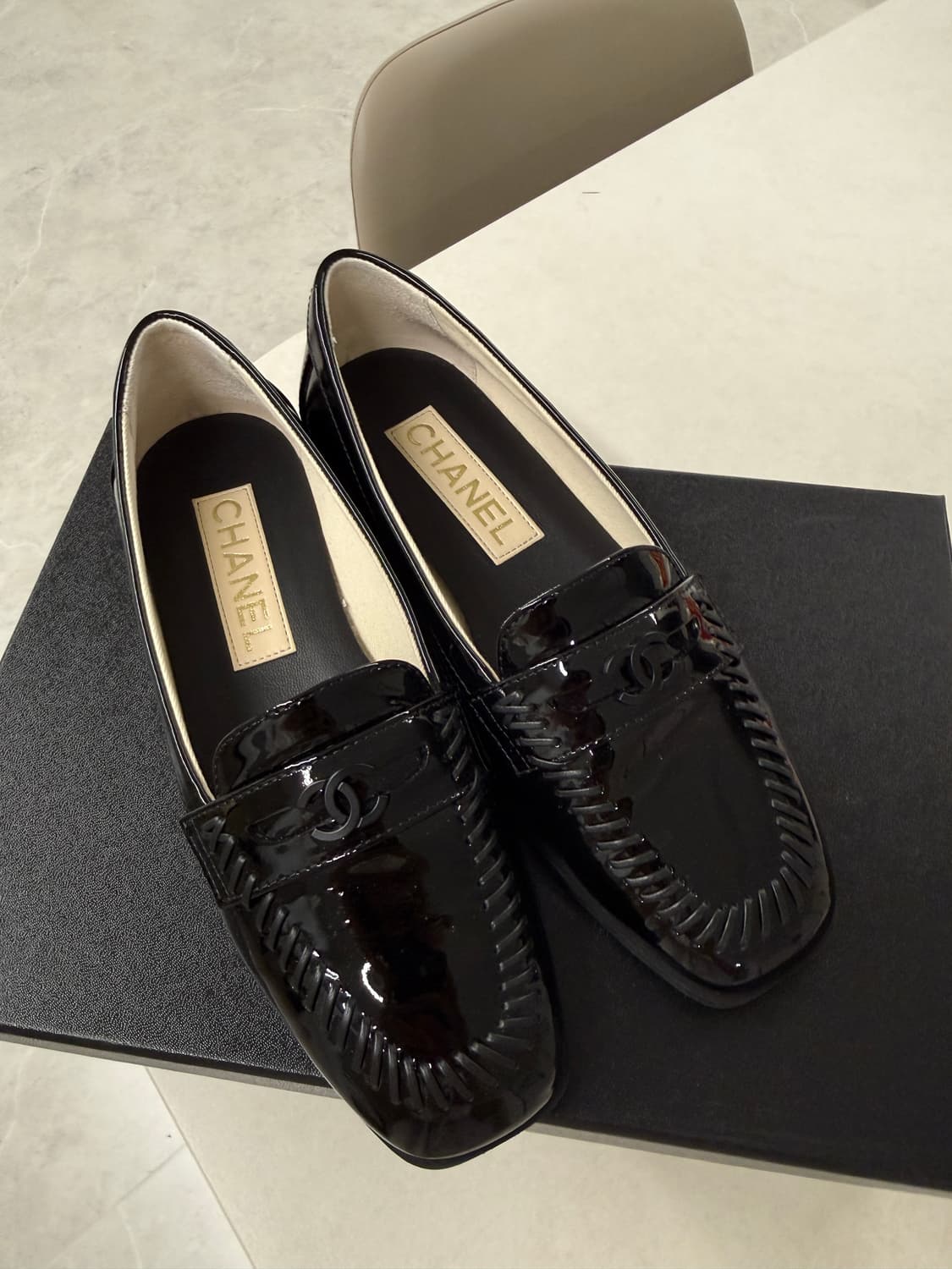 🖤 Chanel 페이턴트 로퍼 판매합니다 🖤 압구정 갤러리아 195만원 구매영수증 있음 ✔️ 상태 • 실착 몇 번 안 한 거의 새상품급 • 전체적으로 깨끗하고 광택 상태 좋음 • 밑창 사용감 약간 있으나 신경 쓰일 정도 아님 ✔️ 특징 • 고급스러운 블랙 페이턴트 소재 • 앞코 스티치 디테일 + CC 로고 포인트로 클래식하면서도 세련된 느낌 • 캐주얼 / 출퇴근 / 하객룩까지 다 잘 어울리는 디자인 ✔️ 사이즈 • 35.5(본인사이즈 225) ✔️ 구성품 • 더스트백 / 박스 (있으면 작성) ✔️ 거래 • 직거래 / 택배 가능 • 예민하신 분은 패스 부탁드려요 🙏