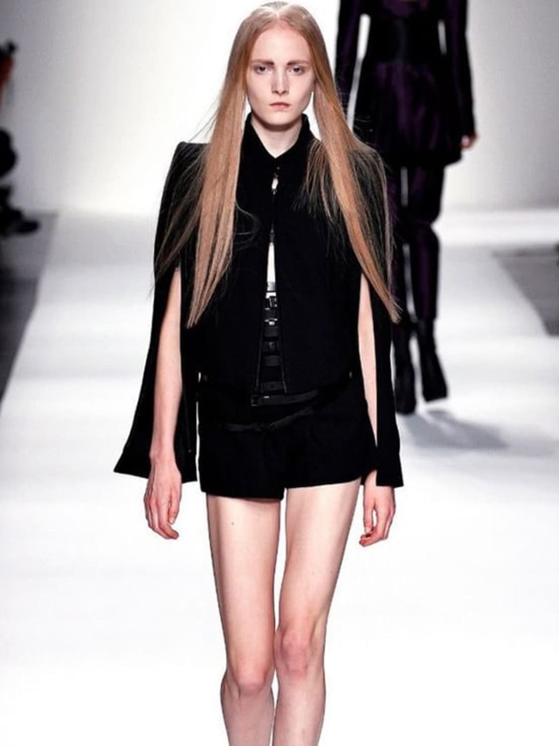 앤 드뮐미스터(Ann Demeulemeester)의 2013년 SS 컬렉션 런웨이 메인 피스인 멀티 지퍼 케이프 자켓입니다. 앤 드뮐미스터는 낭만주의적인 시각으로 해체주의를 재해석하며, 정교한 테일러링과 변칙적인 실루엣의 조화로 잘 알려진 브랜드입니다. 울(Laine) 바디에 소매 안쪽부터 등판을 가로지르는 멀티 지퍼 구조가 적용되어, 지퍼의 개폐 정도에 따라 드라마틱한 실루엣의 변화를 보여줍니다. 지퍼를 모두 닫았을 때는 구조적인 숄더 라인이 돋보이는 미니멀한 크롭 자켓의 형태를 띠며, 지퍼를 오픈했을 때는 팔과 등 라인이 우아하게 드러나며 마치 케이프(Cape)를 두른 듯한 아방가르드한 무드를 강조합니다.