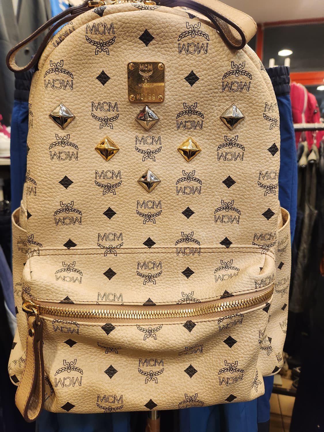 MCM 비세토스 패턴이 돋보이는 백팩이에요 골드와 실버 스터드가 포인트로 들어가서 더욱 고급스러워요 내부에도 MCM 로고가 새겨져 있어 브랜드 감성을 느낄 수 있어요 데일리로 들기 좋은 매력적인 백팩이랍니다 교환반품안되어요 색상및중고감안하여 신중구매부탁드려요 입금순으로드려요 무리한에눌사양해요