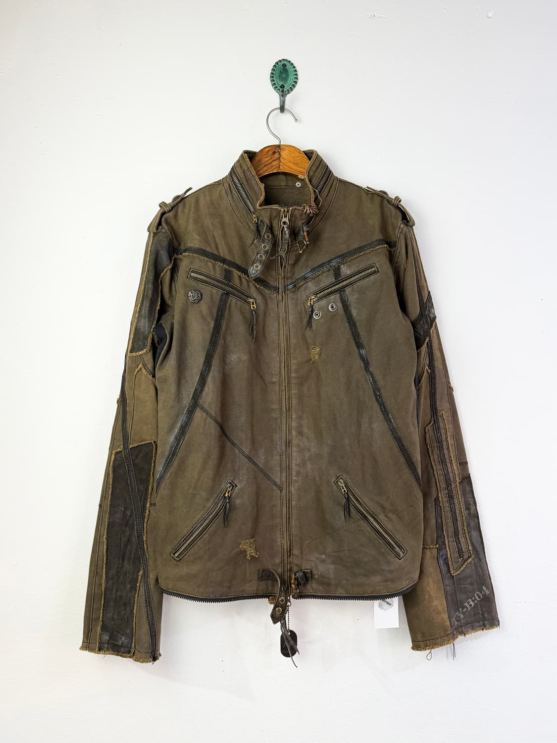 14th ADDICTION desert riders jacket 유목민에 영감을 얻은 포스트 아포칼립스 스타일에 초점을 맞추며 원단과 자재에 확고한 신념을 가지고 휼륭한 퀄리티를 선보이는 Teruki Uchise의 14th ADDICTION 현재까지 다양한 버전으로 출시되고있는 데저트 라이더 자켓입니다. 흔치 않은 XL사이즈, 하단부 도킹되는 레더 파츠 유실된 상태입니다. 어깨 47 가슴 55 총장 70 팔 69 (cm)