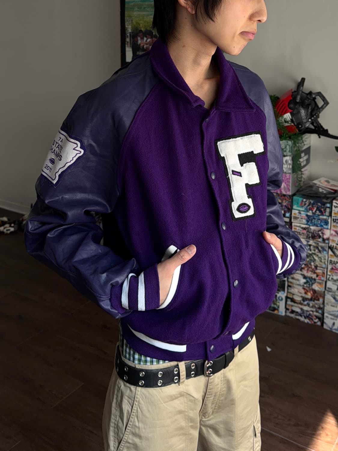 각 주의 체육 협회 내 Top 7을 선정, 그 중에 챔피언으로 선정된 팀을 7A Stae Champ로 명명합니다. 전면부 F로 미루어 보아, 플로리다 주 대표 팀들끼리 격돌하는 FHSAA를 위해 생산된 것으로 보입니다. 범상치 않은 패치 덕에 보라색 야구 잠바의 레벨이 격상되었음을 알립니다. 물론 우리는 정말로 챔피언 팀에 속하려고 오늘의 가먼츠를 입는 것이 아닌 만큼 소소한 재미를 덧붙여 즐겨주시면 되겠습니다. - 1946년 미국 오하이오주에서 시작된 남성 의류 브랜드 - 울 / 가죽 소재 - 바시티 타입 - 레귤러 핏 - 레더 암 - FHSAA 자수 & 패치 - 배색 시보리 S size 어깨소매 85 가슴 56 총장 83 Condition : B (가죽 주름 자국) (짙은 사용감)