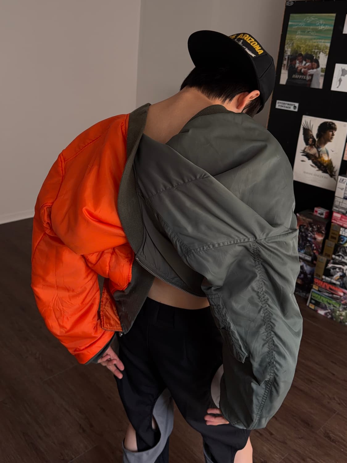 뒤집어 입는 옷은 두 가지 이상의 착용 방법이 존재합니다. 각 절반씩을 내놓아 입는 것으로 Sacai의 무드를 흉내 내볼 수도 있겠습니다. 물론 정석적인 방법도, 편안한 착용을 우선시하는 것이 아닙니다. 가능성을 내포하며 더 많은 스타일링 방식을 제안하고자 합니다. 순수한 봄버로서 즐겨주셔도 좋습니다. - 나일론 및 폴리에스터 소재 - 봄버 / 리버서블 자켓 타입 - 오버 사이즈 핏 - 볼류밍 암 추정 M size 어깨 51 가슴 65 소매 71 암홀 29.5 총장 65 Condition : A (전체적인 사용감)