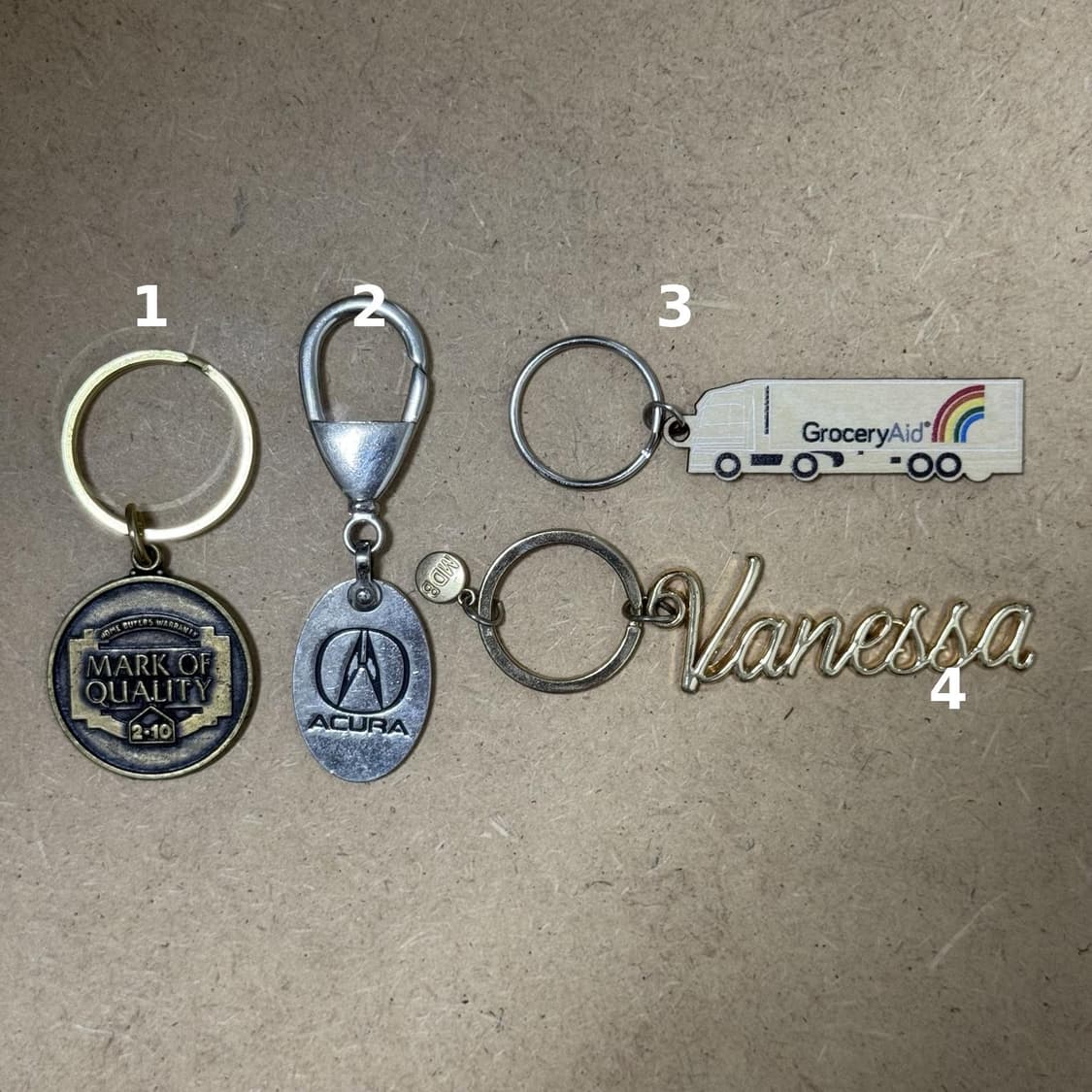 1. 원형 메달 키링 2. Acura 키링 3. 트럭(GroceryAid) 키링 4. Vanessa 키링 미국 빈티지 무드가 느껴지는 레트로 키체인 모음입니다. 여행지 기념품 특유의 감성, 오래된 향수병 라벨을 떠올리게 하는 그래픽, 그리고 세월감 있는 메탈 소재가 어우러져 소장가치가 높은 아이템들입니다. 가방, 열쇠, 파우치에 달아 포인트 주기 좋고, 빈티지 컬렉션이나 레트로 소품을 좋아하시는 분들께 추천드립니다. 각각 개성이 달라 단품으로도, 여러 개를 함께 매치해도 분위기 있게 연출됩니다. 개당가격입니다. 문의사항있으시면 연락주세요. 감사합니다.