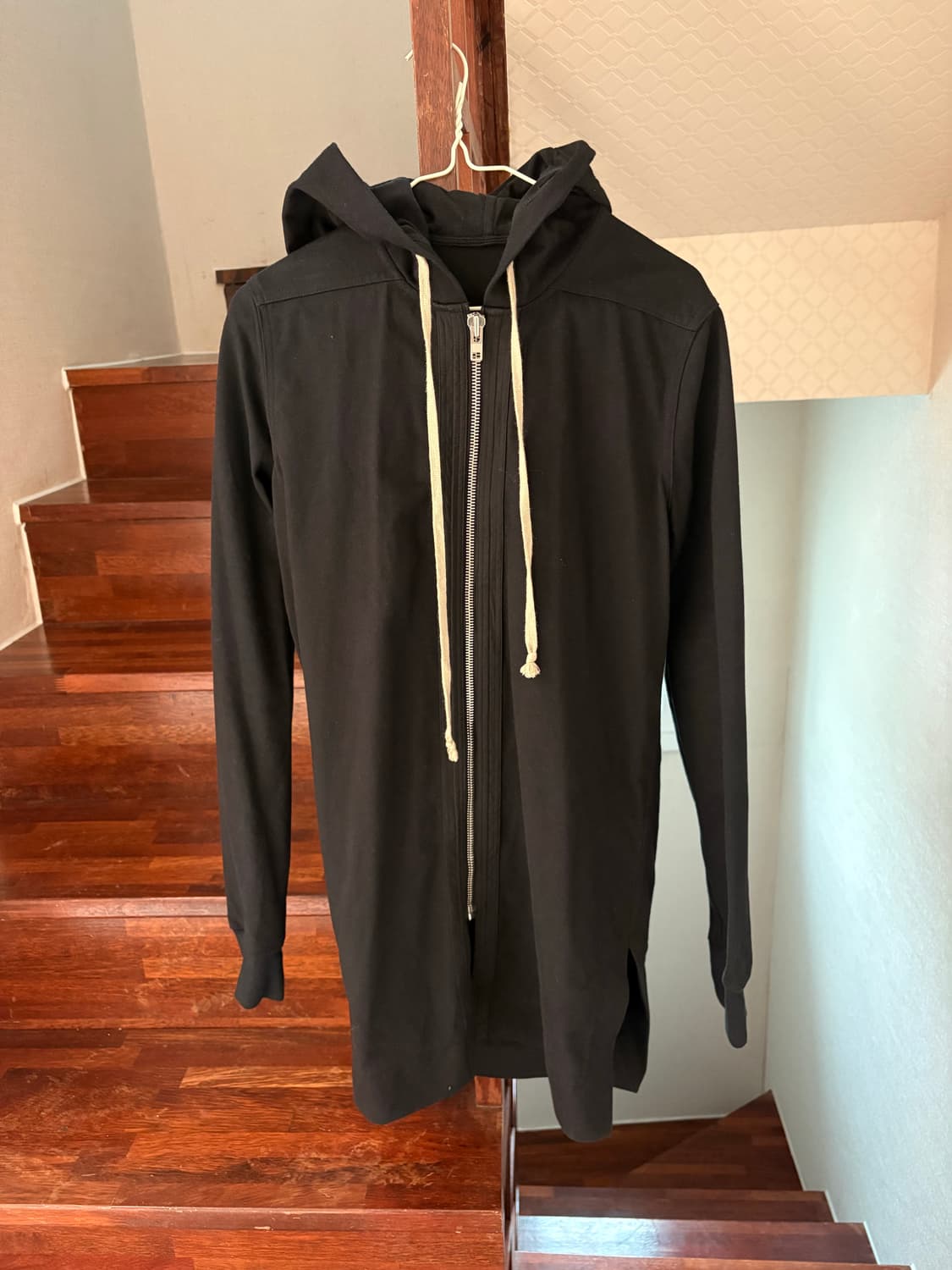 Rick Owens long hood zip-up 미니멀한 실루엣에 롱기장과 대비되는 화이트 드로우스트링이 특징인 Rick Owens 특유의 FW 대표모델 다크웨어 감성 후드 집업입니다. Chest: 46 Shoulder: 40 Length: 81 Sleeve: 67
