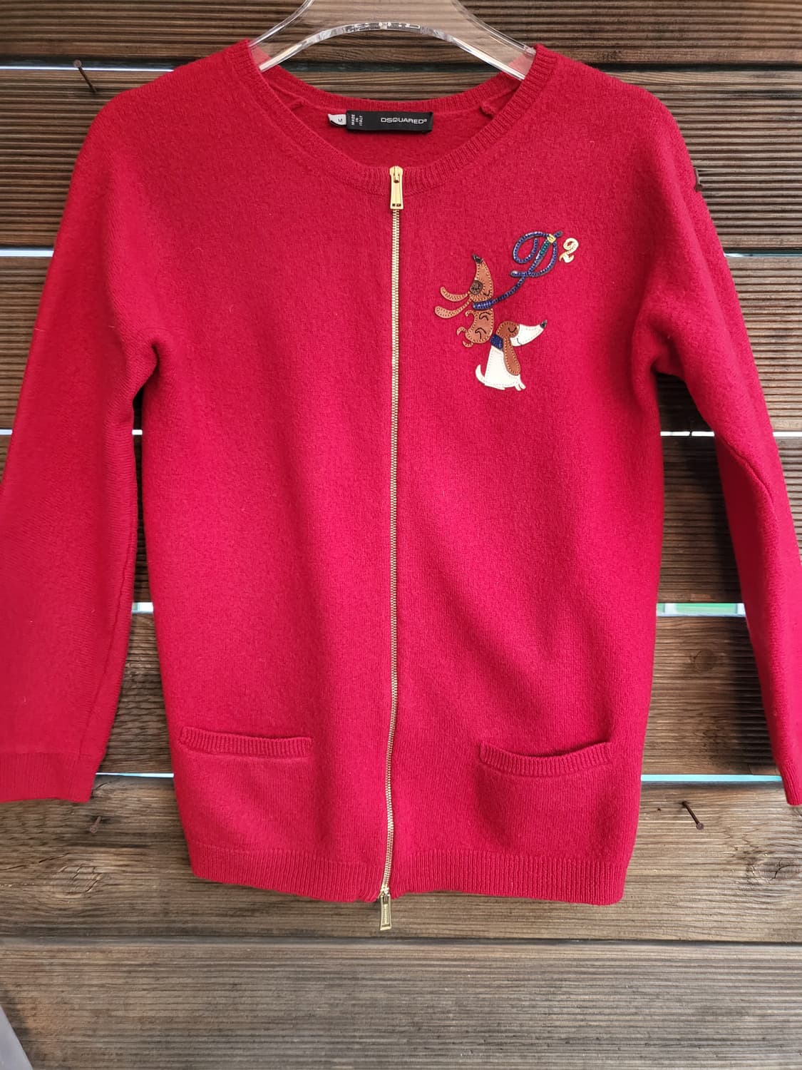 DSQUARED2의 매력적인 레드 컬러 집업 가디건이에요 귀여운 강아지 자수가 포인트로 들어가 있어 유니크한 디자인이 돋보여요.일본에서 꽤비싸게 구매했습니다. 이탈리아에서 제작되었구요 최고사양의 얇은 울100%라 엄청 부드러워요. 레드컬러가 독특하고 세련된 보이는 흑장미컬러와 유사하고요.2지퍼또한 브랜드각인이 이쁘게 있습니다. 상태는 괜찮지만 민감하신분들은 새제품 구매하세요.