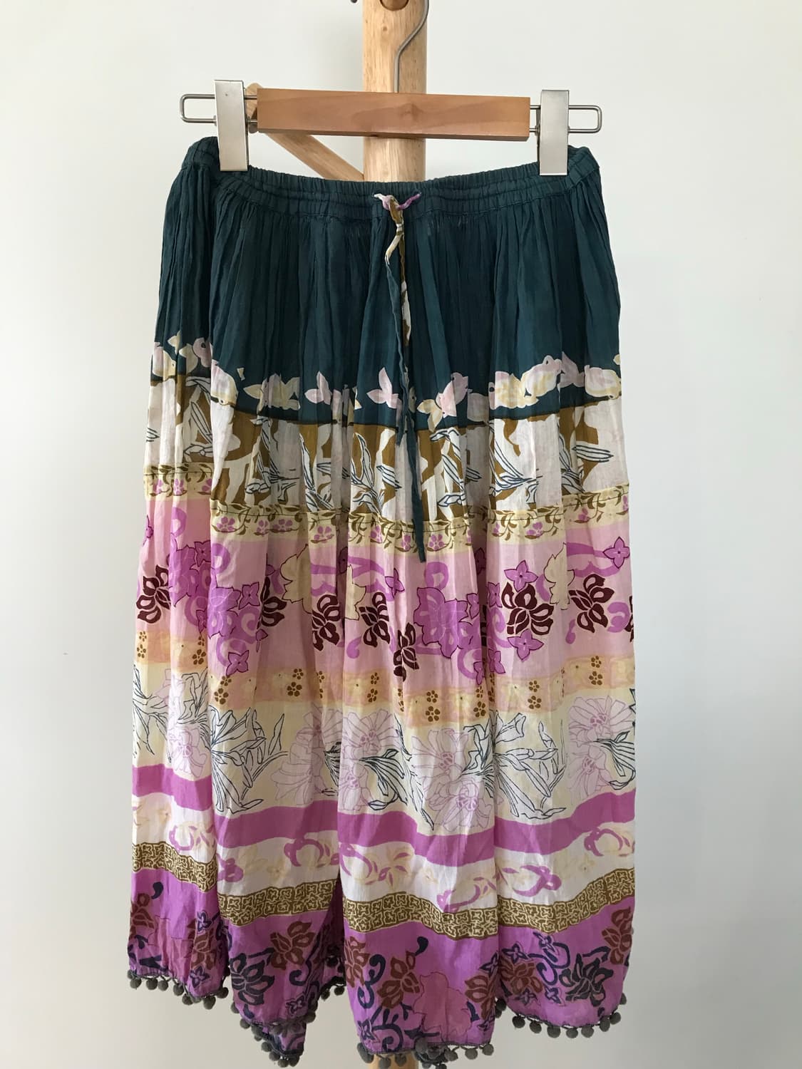 패턴과 색감이 넘 예쁜 모리걸 롱스커트입니다 밑단 퐁퐁이가 포인트! 하나만 입어도 완성형이지만 바지와 레이어드하면 더 예뻐요 허리는 28cm에서 54cm까지 늘어나요 model 159/52