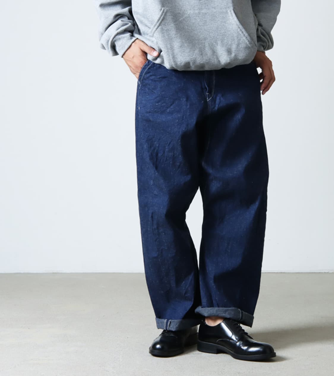 · Barrel Painter Denim Pants 입니다 · 페인터 팬츠와 5포켓 데님의 디테일을 융합시킨 제품입니다 · 10oz의 넵 데님 원단 사용되었습니다 · 넵 원단 특유의 거친 질감과 부드러운 원단감의 제품입니다 · 입체감있는 둥근 실루엣이 특징입니다 · MADE IN JAPAN · 표기 사이즈 M · 허리 43 / 허벅지 40 / 밑위 36 / 밑단 26 / 총장 101 (측정법에 따라 1~2cm 오차가 존재할 수 있습니다)