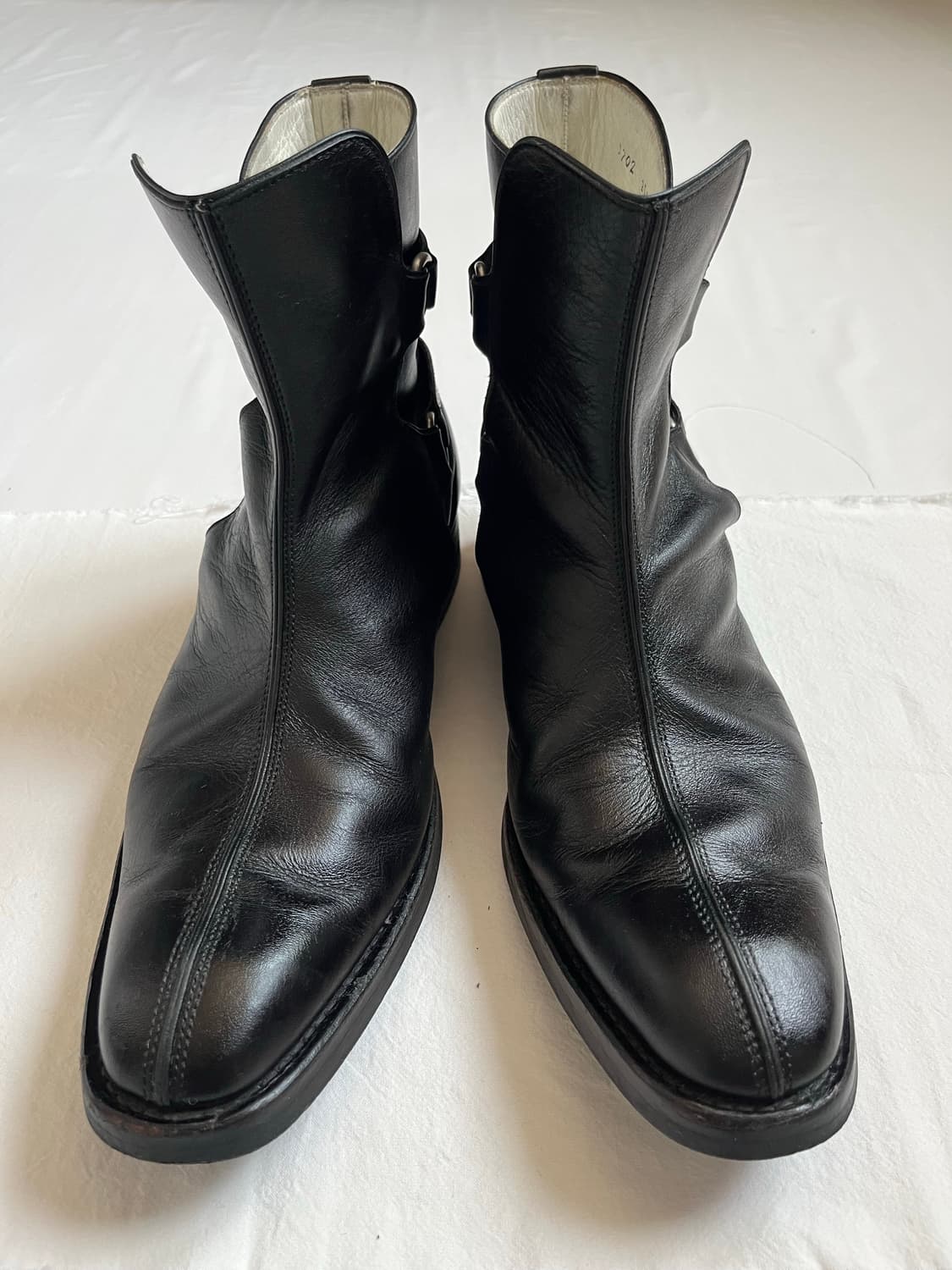 N.hoolywood AW03 「Dress Door」 Double Strap Jodhpur Boots / sizeM fits 270-275 Hill: 3 Sole Length: 32 Color : Black Price: 250,000 Dm to purchase. (N.hoolywood)」 디자이너 다이스케 오바나에 의해 2001년도 설립. 클래식한 밀리터리부터 시작하여 스포츠웨어와 빈티지 의류에서 얻은 영감을 바탕으로 개성적이면서도 현대적인 방식으로 재해석 및 창조해내는 브랜드입니다. / *아웃도어 스타일과 드레스 스타일의 요소를 융합하여 엔헐리우드를 대표하는 컬렉션으로 회자되는 2003 A/W 「DRESS DOOR」기의 제품입니다. 링과 버튼을 활용한 더블 스트랩 사양으로 입구의 폭을 조절할 수 있기 때문에 부츠 인/아웃 모두 최적입니다. 20년 이상 전의 초기 아카이브 제품이지만 굽의 마모는 적은 편이며, 전반적으로 연식 대비 준수한 컨디션입니다. 내부는 흰색이기 때문에 변색이 존재하지만, 착용시에 눈에 띄거나 신경 쓰이지 않습니다. 연대물로서의 희소 가치는 충분하다고 생각합니다. 출품 전에 가죽 에센스를 활용하여 케어를 마친 상태입니다. 더 많은 디테일 샷은 IG: @phen1xclub