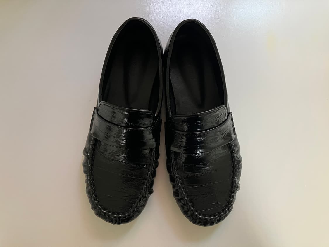 *상품명: 심플링클플랫로퍼 *사이즈: 235 *택배: 편의점택배 *교환 및 환불X *사진처럼 12월에 구매하였고 3-4번 정도 착용하였으며 끝에 표시해둔 사진처럼 압정이 박힌 흔적이 있습니다 :)