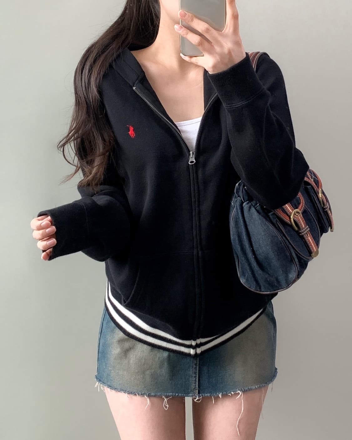 [ 폴로 후드집업 ] * 클래식한 무드의 블랙/레드 포니 조합,,♥️ 군더더기없이 깔끔한 디자인으로 매년 유행에 구애없이 입기 좋은 폴로 후드집업 준비했어요 :) 여유있는 핏으로 누구나 편안하게 코디하기 좋답니다. 가격 : 65,000 실측 : XL18-20 총장 64 가슴단면 52 어깨 42 소매 63 모델 : 160/50