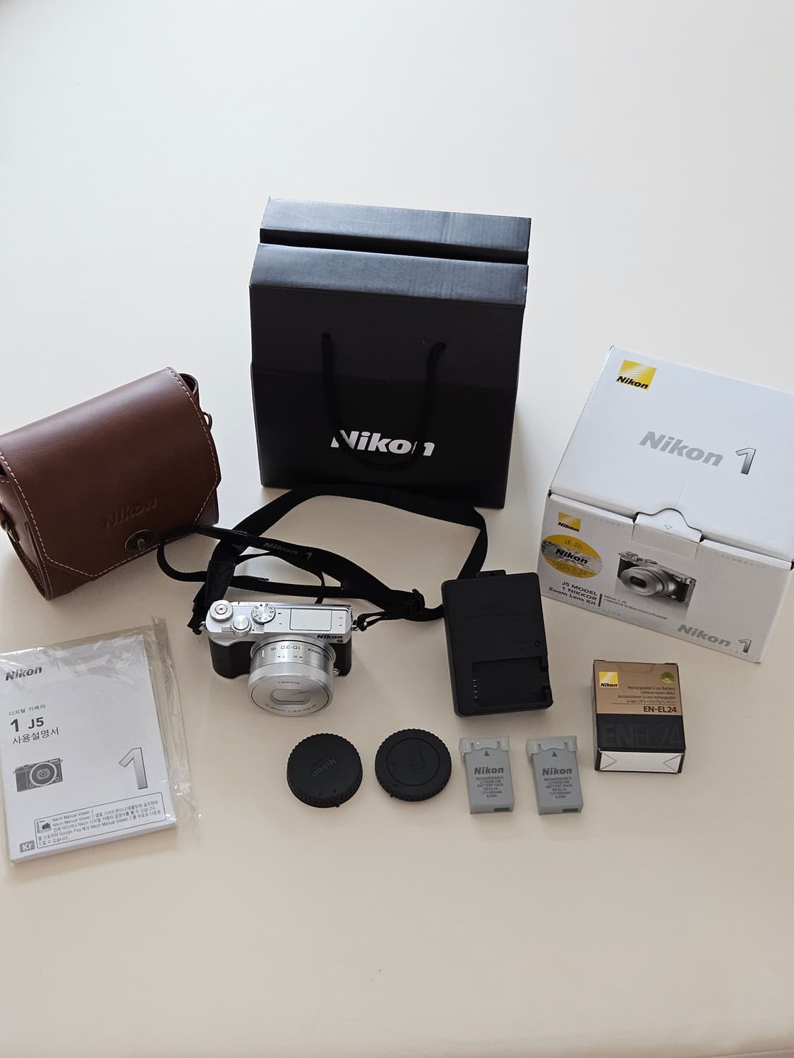 니콘1 j5 상태 A급 깨끗해요 크기도 작고 가볍고 사용하기 편해요 샀을때 구성 그대로 풀박스 가죽케이스 구성입니다. ❌️메모리 카드는 없습니다. 📌중고 특성상 환불 불가