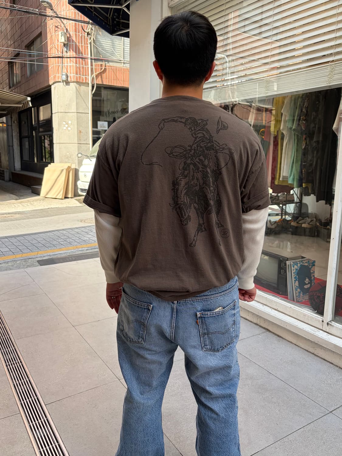 90‘s Marlboro country west cowboy hard faded T-shirt 기호식품 중 담배 브랜드 중 가장 유명한 브랜드인 `Marlboro’ 사의 country 웨스트 카우보이 티셔츠입니다. 일종의 꼭 의류브랜드가 아니더라도 과거 미국 브랜드에선 특정 스폰서의류나 굿즈와 같은 상품들을 자주 만들기도 했었습니다. 그런 것중에 빈티지는 특정 의류에 빠진다긴 보다, 문화나 그 시절의 배경에 초점을 두고 의류가 해당되는 영역이다 보니 해당 피스처럼 저런 재밌는 요소가 있기도 한 거 같네요. 본 피스는 말보로 마일즈(Marlboro Miles) 보상 프로그램의 일환으로 제작된 캠페인 제품입니다. 해당 캠페인은 담배 갑이나 보루에 인쇄된 마일점수를 직접 가위로 오려 모와 일정 점수가 쌓이면 전용 카탈로그인 '말보로 컨트리 스토어'를 통해 티셔츠, 지포라이터, 데님 재킷 등으로 굿즈를 교환할 수 있었습니다. 본 티셔츠는 그중에서도 미국의 거친 서부 정신을 강조한 특별 라인업으로, '말보로 맨(Marlboro Man)'으로 상징되는 카우보이 문화를 잘 보여줘 인기가 많기도 한 개체입니다. 하드하게 익어진 바디, 카우보이 프린트 등의 디테일이 우수하게 제작이된 개체입니다. 아마 빈티지를 좋아하시는 분들에겐 충분히 알아보실만한 녀석이라 마음에 드실 녀석이지 않나싶네요. 사이즈도 낭낭한 편이며 길이가 길다면 편하게 자르시거나 다양한 연출용으로 착용해보시길 권해드려보는 녀석입니다! - 총장 73 어깨 62 가슴 65 소매 22 - Size: One size (표기, 실착기준 XL) - Price: 12.0 - • 빈티지 특성상 약간의 오염이 있을 수 있습니다. • 교환, 환불이 어려워 신중한 구매부탁드립니다. • 약간의 사이즈 오차(1,2cm)가 있을 수 있습니다. - Contact DM Discount ALSO