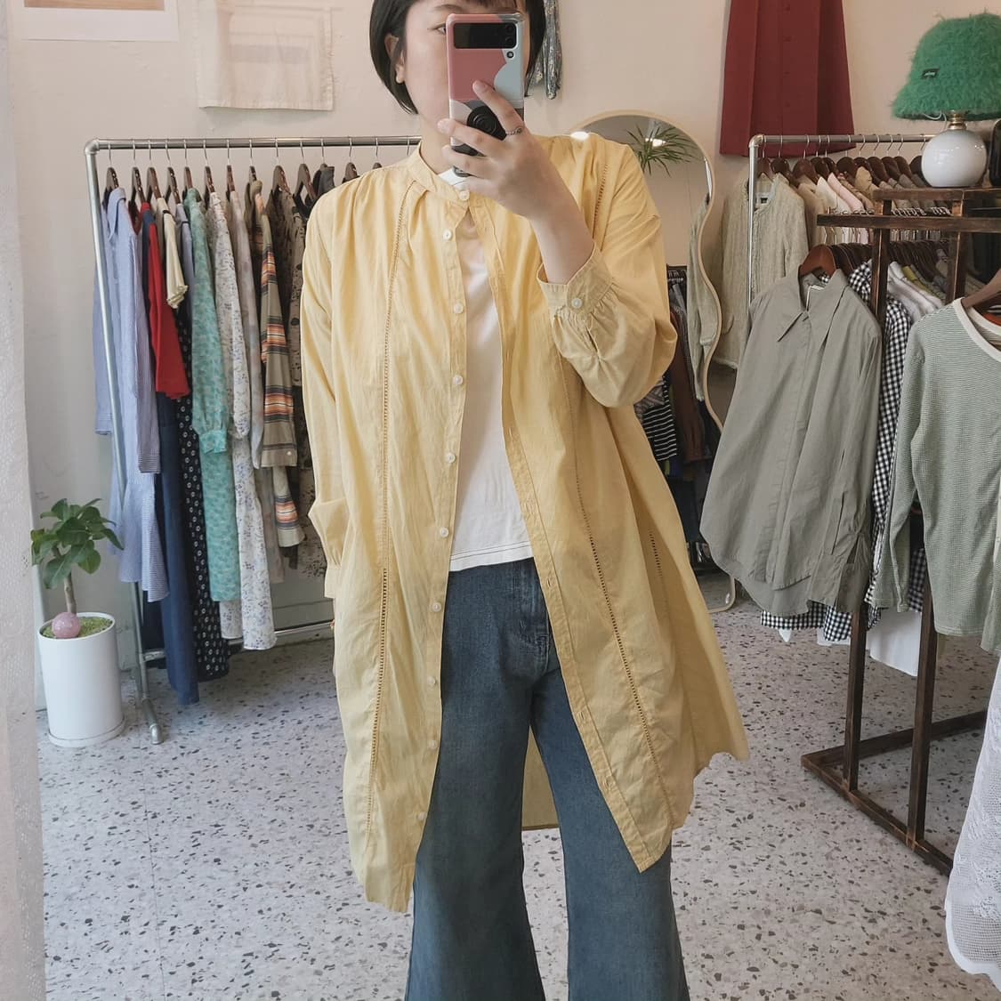 어깨:드롭 가단:67 총장:92 표기:M 소재: 면100 가격: 28,000 - 55~77추천/ 마네킹은 55, 주인장은 66반 - 얇은 순면에 연한 머스터드 컬러, 펀칭 디테일이 화사하고 우아한 롱셔츠. 그냥 너무 예쁩니다.🥹 *오염, 하자 부분은 사진에 별도 표기해드리며 따로 코멘트가 없는 상품은 컨디션에 이상이 없는 제품들입니다. *꼼꼼하게 검수하고 손질하여 보내드리지만 빈티지 특성상 미처 발견 못한 작은 이염이나 데미지가 있을 수 있어 신중한 구매 부탁드립니다. *배송비는 3,500원 별도이며 5만원 이상 구매 시 무료배송입니다. 문의사항은 언제든 dm주세요!😀