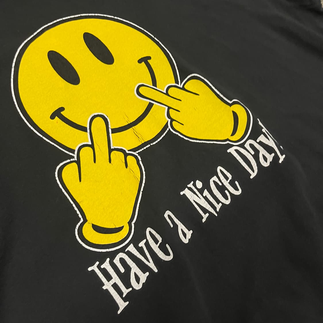 짧뚱한 패턴의 프린트 아트웍이 돋보이는 미드 핑거 스마일 티셔츠입니다🙂 표기(체감): XXL(110) 실측: 가슴65 총장72 176/70 착용