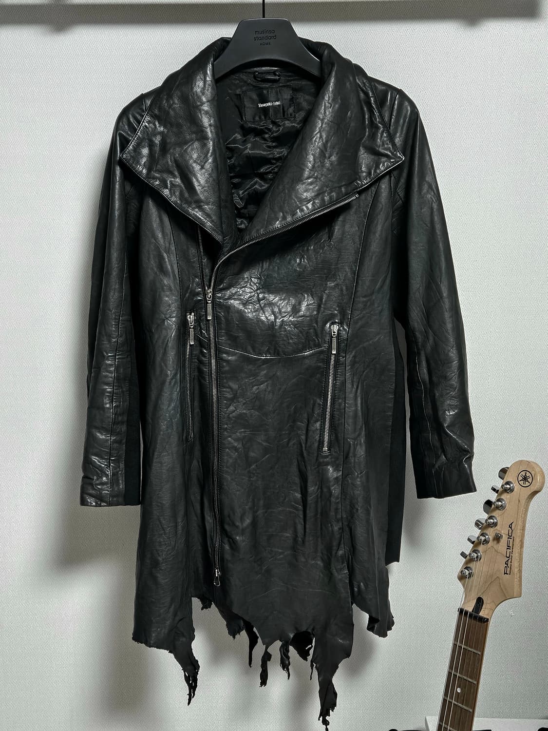 가죽을 중심으로 한 락과 펑크, 언더그라운드 감성을 담아 일본에서 컬트적인 팬층을 구축한 아티잔 브랜드 ‘야스유키 이시이’의 아카이브 피스입니다. 지퍼를 조절해 다양한 넥 형태로 연출할 수 있습니다. 사선으로 떨어지는 지퍼 디테일이 독특한 개성을 더합니다. 천연 소가죽을 워싱하여 완성된 질감과 자연스러운 주름이 매우 매력적이며, 마치 태워서 제작한 듯한 밑단 디테일이 제품의 독창적인 분위기를 한층 강조합니다 현재는 구할 수 없는 단종된 자체제작 제품으로 그레일드에서 850$로 팔고 있는 매물 외 유일매물입니다. Condition: 8/10 Size: M - Shoulder: 43 - Chest: 50 - Length: 107