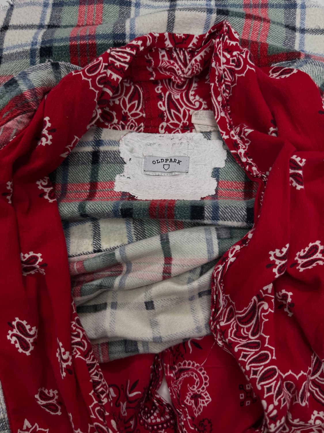 2012년 일본 디자이너 나카무라 기미노리 (Kiminori Bakamura)가 설립 / 빈티지 의류, 데드스탁 원단을 리메이크하여 전개하는 OLDPARK OLDPARK BANDANA DETAIL FLANNEL SHIRT 다양한 컬러가 믹스된 플란넬 체크 셔츠를 기반으로, 전면 중앙부 레드 컬러 페이즐리 반다나 스카프를 일체형 구조로 리메이크한 제품 밑단 및 일부 부분 의도적인 컷오프 처리, OLDPARK 시그니처인 패턴이 완벽히 맞지 않는 비정형 구조 Model : 182 / 60 Shoulder : 44cm Chest : 54cm Sleeve : 60cm Length : 82cm