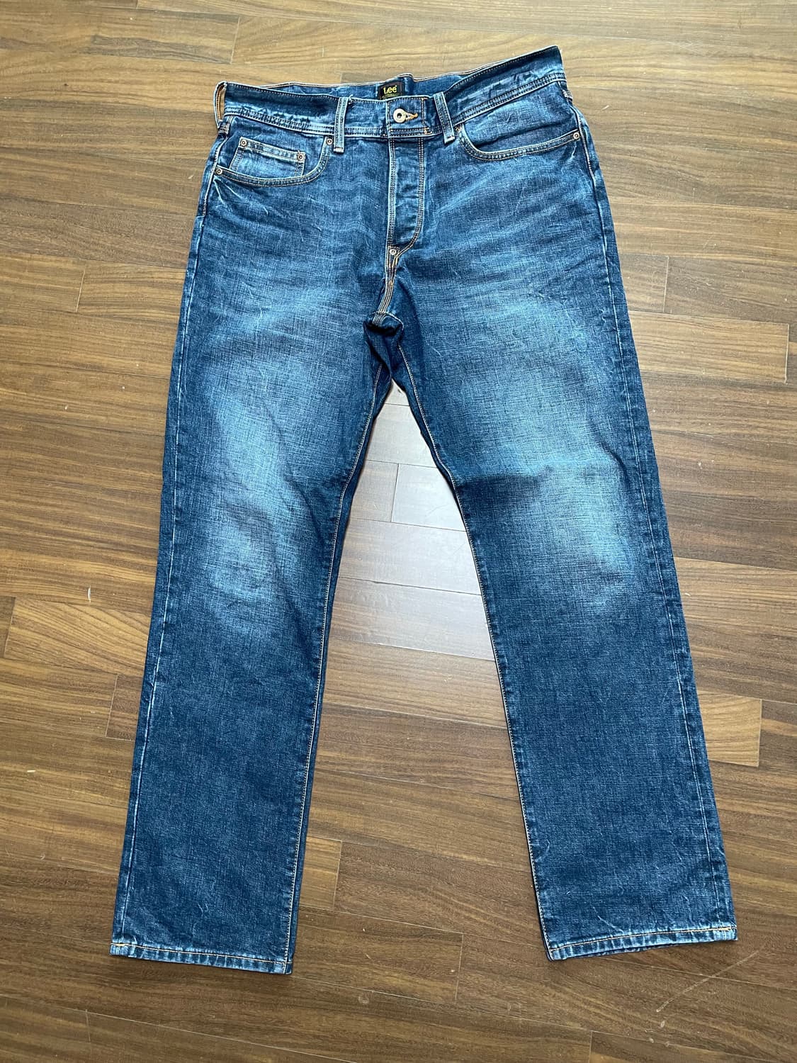 주요 디테일: 신치백, 리 카우보이 단추, 가랑이 리벳, 트리플 스티치 등 1937년 오리지널 디테일 완벽 재현 상태: 자연스러운 워싱과 거친 원단감이 살아있는 컨디션 좋은 제품입니다 실측 허리 44 허벅지 34 밑단 21 밑위 31 총길이 110