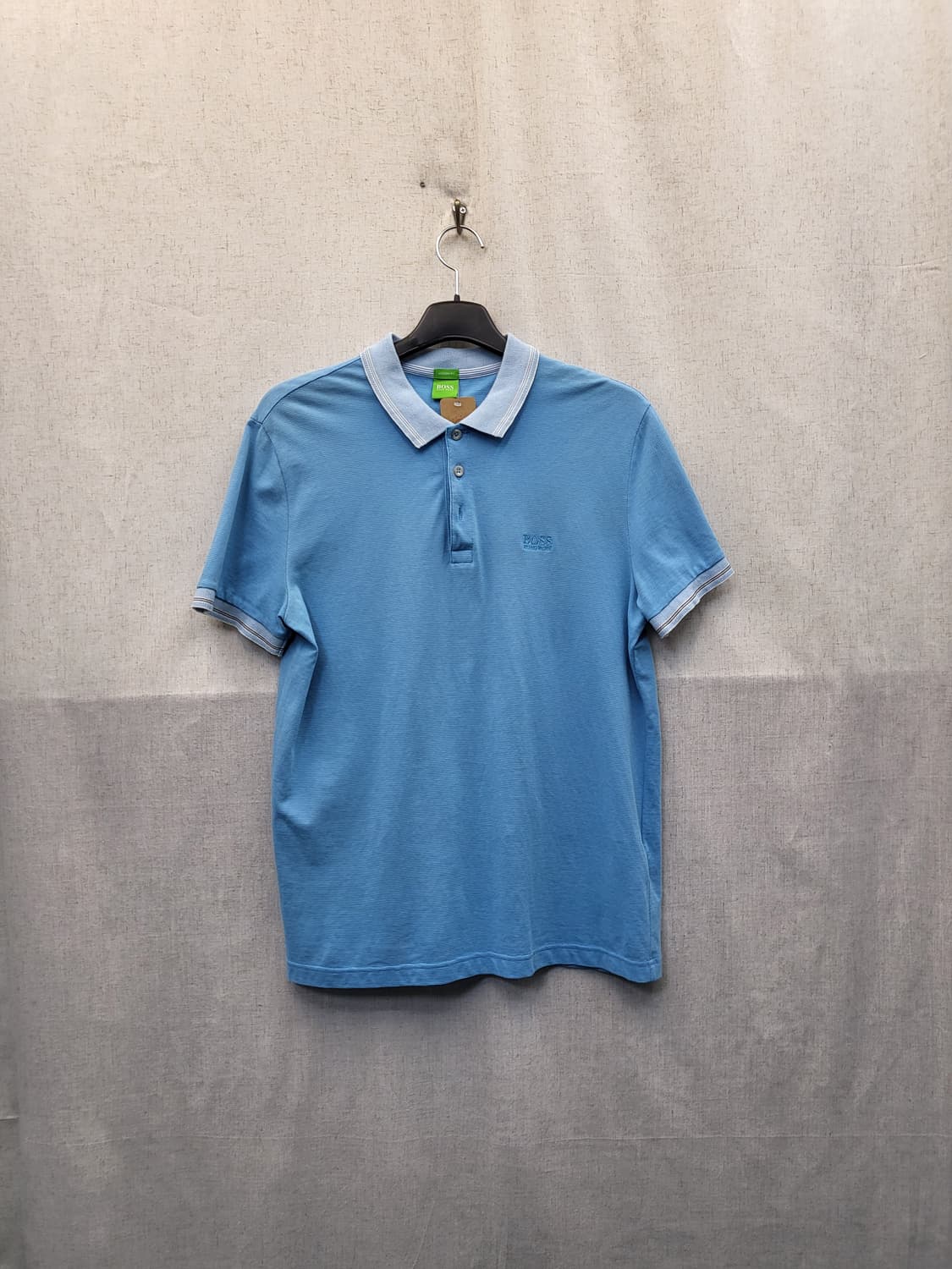 보스 하늘색 반팔 폴로티입니다. 시원한 하늘색에 흰색으로 포인트가 들어가있습니다. 약간 사용감 있지만, 깨끗하게 입으실 수 있습니다. 가슴단면 50 총장 69 반품불가