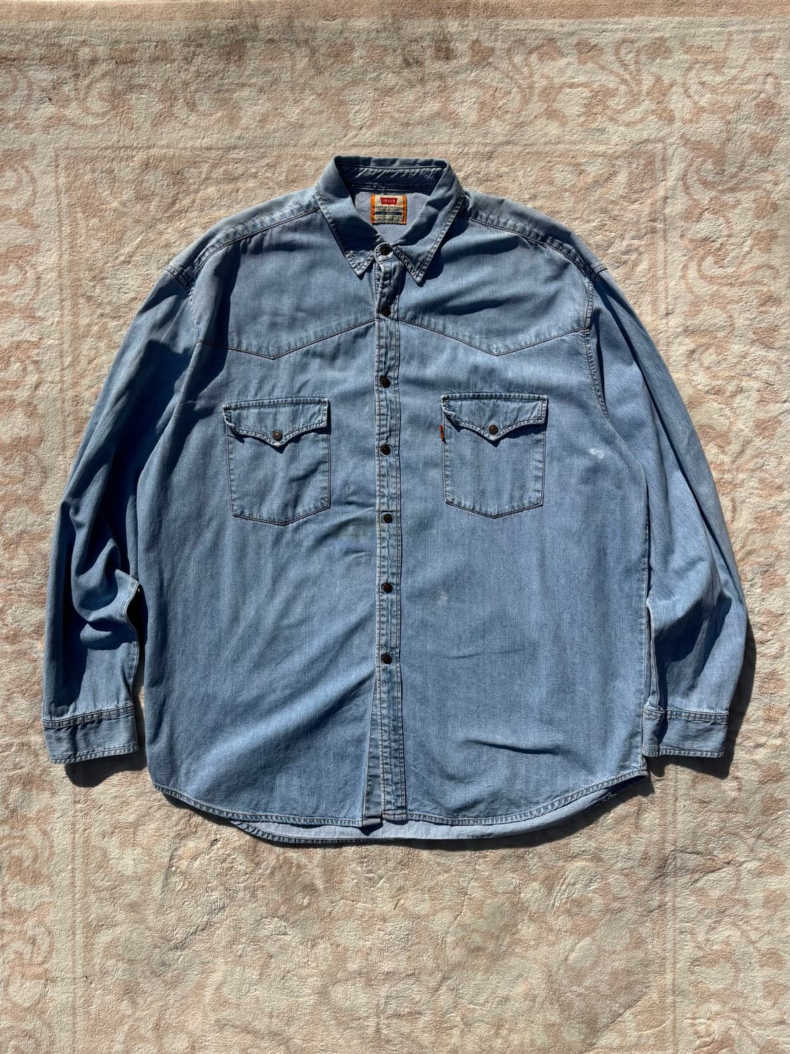 가슴 70 총장 80 어깨 56 팔 65 리바이스 오렌지탭 라인의 빈티지 웨스턴 데님 셔츠입니다. 부드럽게 워싱된 라이트 블루 컬러와 자연스러운 페이딩이 매력적인 제품으로, 클래식한 웨스턴 요크 디테일과 더블 플랩 포켓, 스냅 버튼 디테일이 특징입니다. 가슴 포켓의 오렌지탭 디테일로 리바이스 특유의 헤리티지를 느낄 수 있으며, 전체적으로 편하게 떨어지는 실루엣으로 단품 또는 아우터처럼 활용하기 좋은 아이템입니다. 데님 팬츠나 부츠와 함께 매치하면 웨스턴 무드를 자연스럽게 살릴 수 있는 빈티지 셔츠입니다.