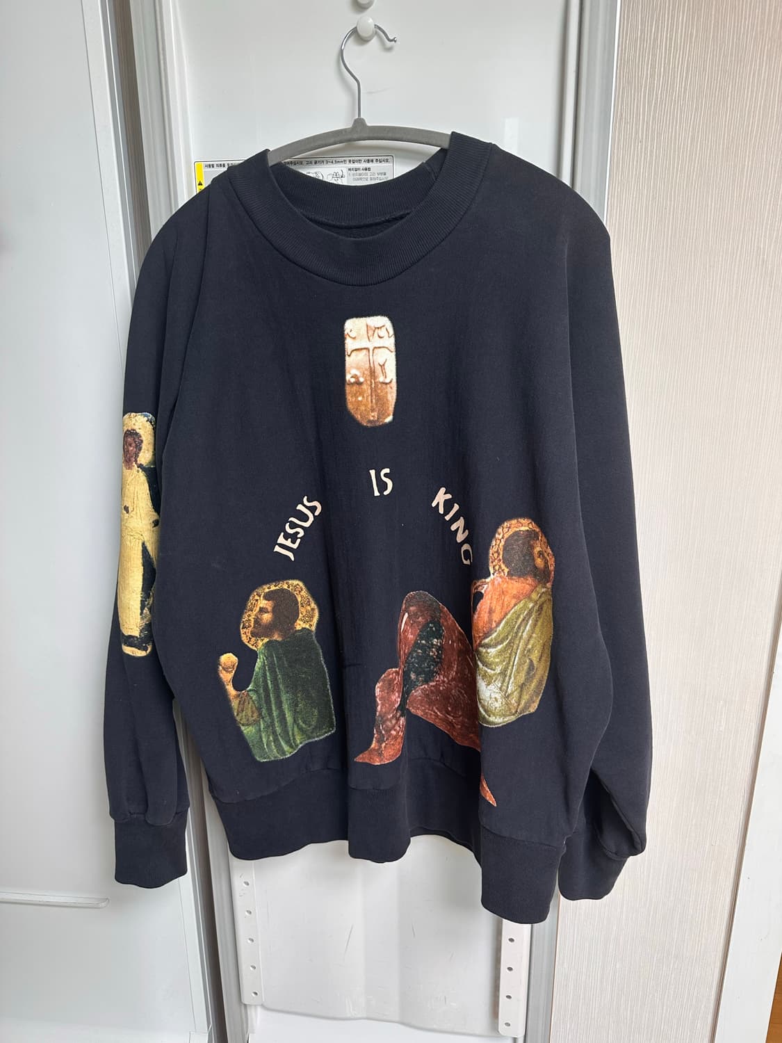 Kanye west jik crewneck 사이즈 L, 밑단에 작게 검정 자국 있습니다.