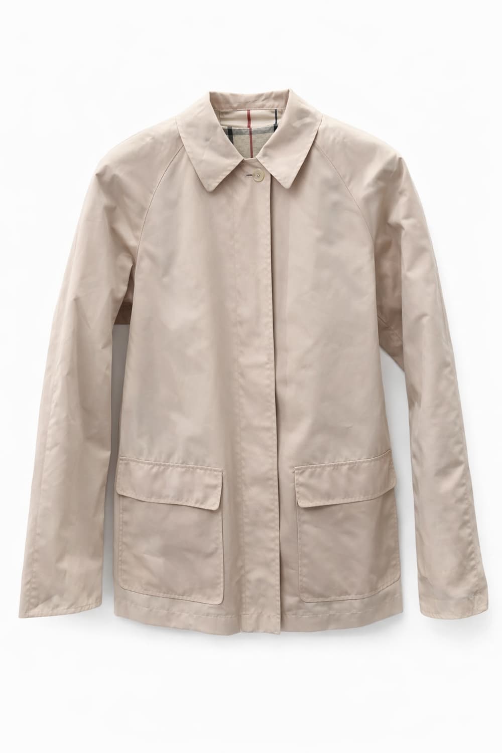 버버리 런던의 베이지색 코트예요. 폴리에스터 소재로 제작되었으며, 안감은 면과 폴리에스터 혼방으로 되어 있어요. 깔끔한 디자인으로 어떤 옷에도 잘 어울린답니다. 데일리로 편하게 입기 좋은 아이템이에요