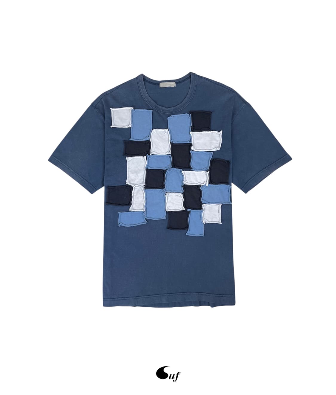 rolled edge patchwork T-shirt Brand : COMME des GARÇONS - Label : COMME des GARÇONS HOMME by Keiichi Tanaka 2003 spring/summer Size : - 총장 : 71 - 가슴 : 52.5 - 어깨 : 51 - 소매 : 22 • 전면 롤드 엣지 패치워크 • 네크라인 및 소맷단 페이딩 • 전체적인 약간의 사용감